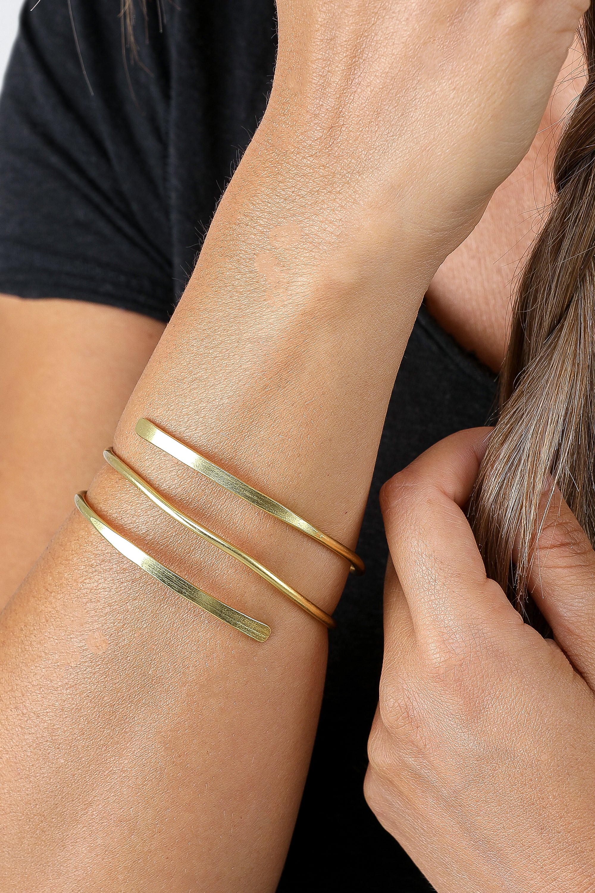 Bangle a spirale: due giri fluidi che disegnano il polso con un segno moderno e femminile. Apertura frontale per indossarlo facilmente; leggerezza e comfort assicurati. Realizzato a mano in ottone riciclato. Nickel tested. Lavorazione artigianale. Gioielli fatti a mano, unici e artigianali, perfetti per tutti i tuoi look o come idea regalo.