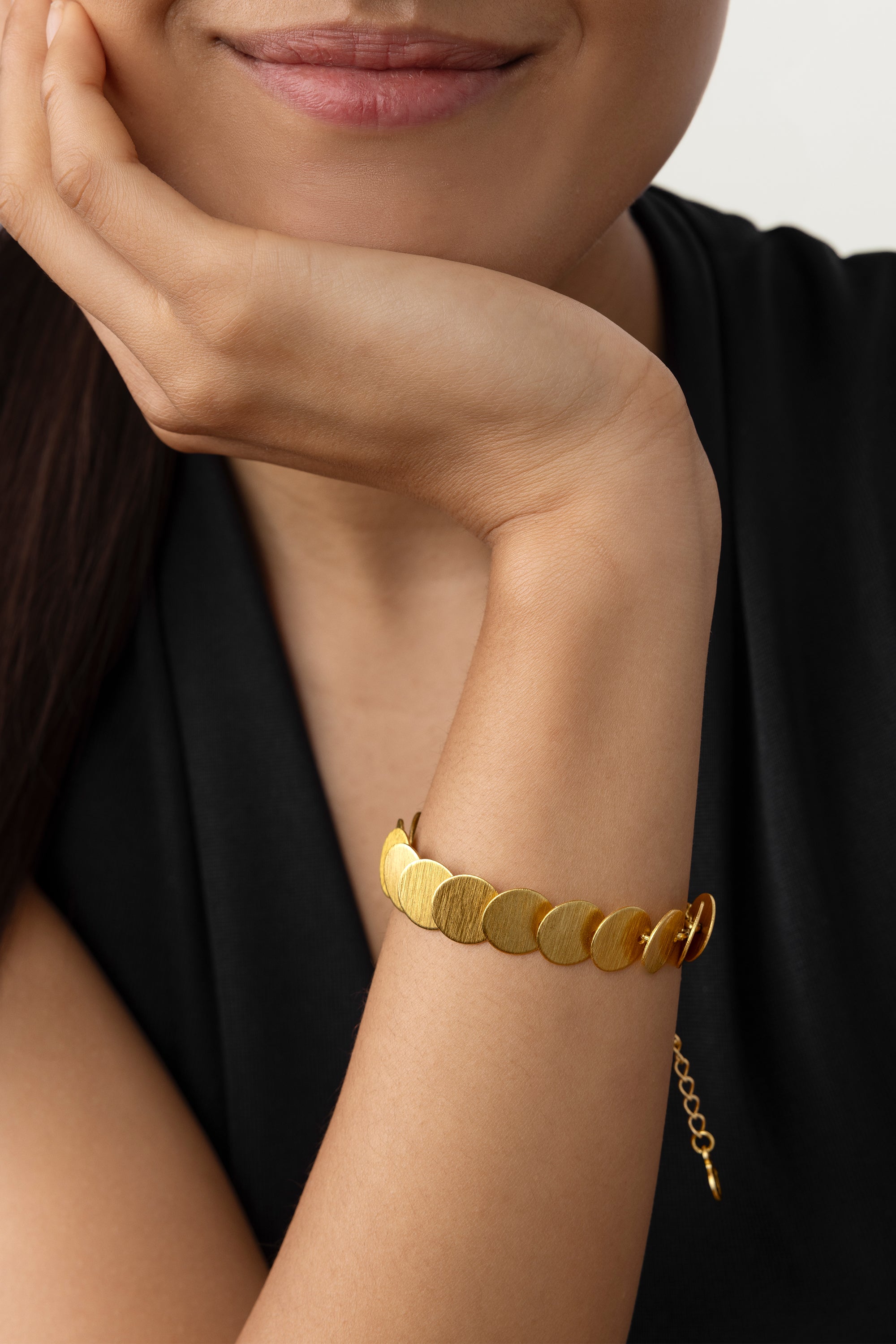 Bracciale a elementi tondi effetto moneta con finitura satinata a righe che diffonde una luce calda; design flessibile e confortevole al polso; chiusura con moschettone regolabile per adattarlo alla misura desiderata. Realizzato a mano in ottone riciclato. Nickel tested. Lavorazione artigianale. Gioielli fatti a mano, unici e artigianali, perfetti per tutti i tuoi look o come idea regalo.