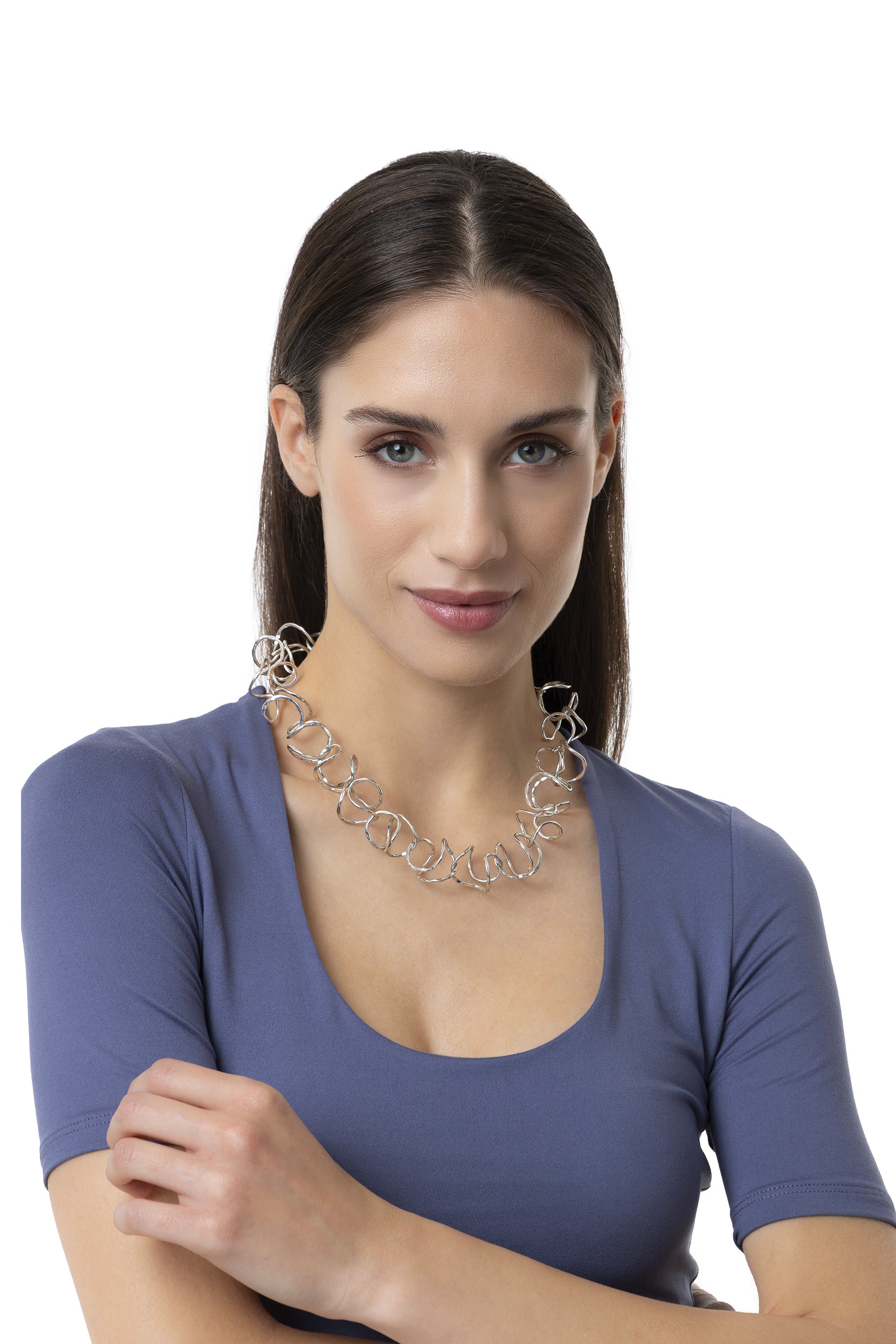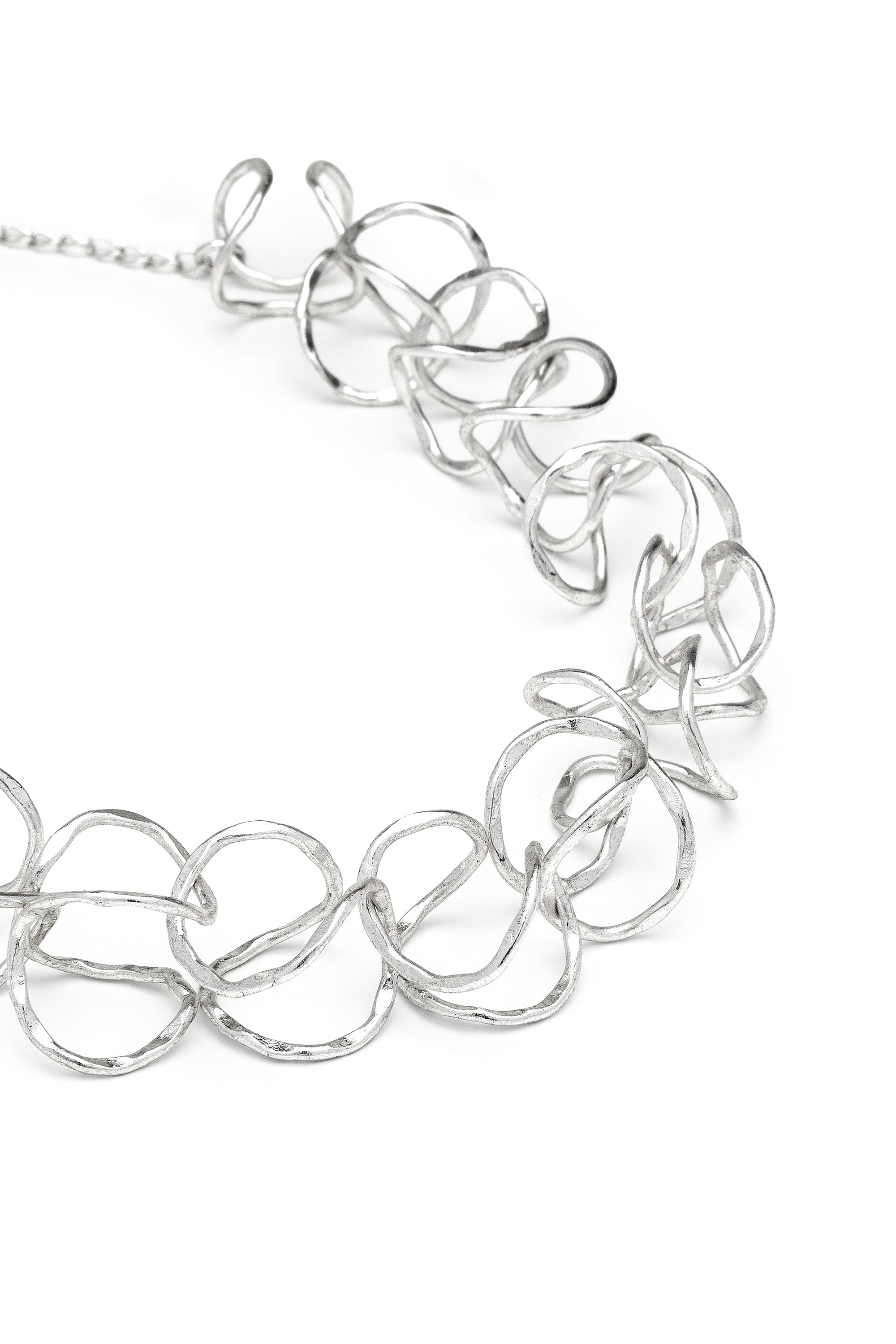 Design scultoreo e sinuoso per questa collana: una sequenza di elementi aperti e irregolari si intreccia in un ritmo organico che cattura la luce e incornicia il d?collet? con carattere contemporaneo. Abbinala agli "Orecchini Curve Silver" coordinati. Lunghezza regolabile. Placcatura argento. Nickel tested.
