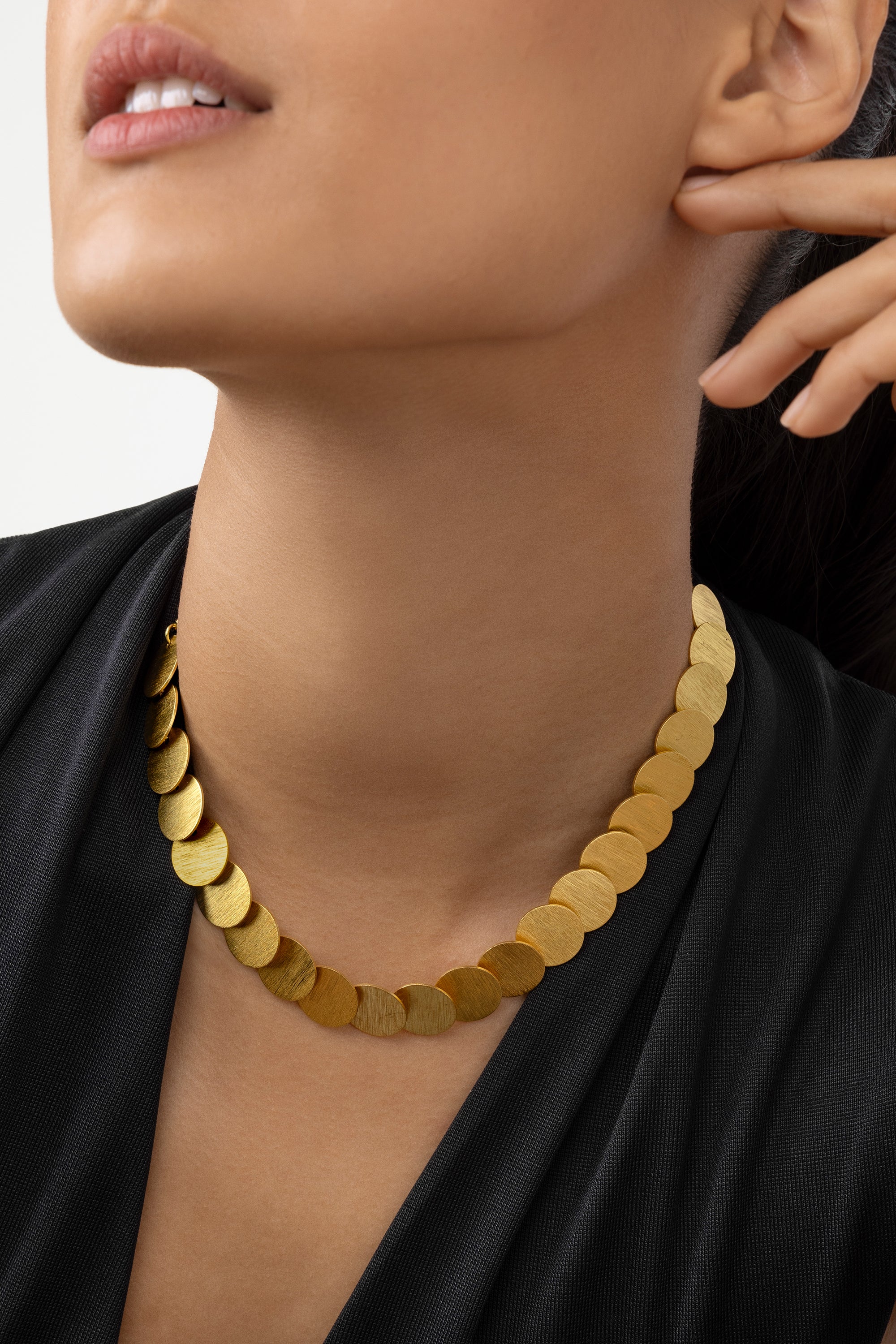 Questa collana in ottone riciclato è caratterizzata da una sequenza di dischi effetto moneta dal profilo liscio che riflettono una luce calda, realizzata a mano con lunghezza regolabile. Essenziale e versatile day-to-night: da sola come punto luce o in layering su camicie, maglieria e abiti minimal. Chiusura con moschettone regolabile. Nickel tested. Lavorazione artigianale. Gioielli fatti a mano, unici e artigianali, perfetti per tutti i tuoi look o come idea regalo.