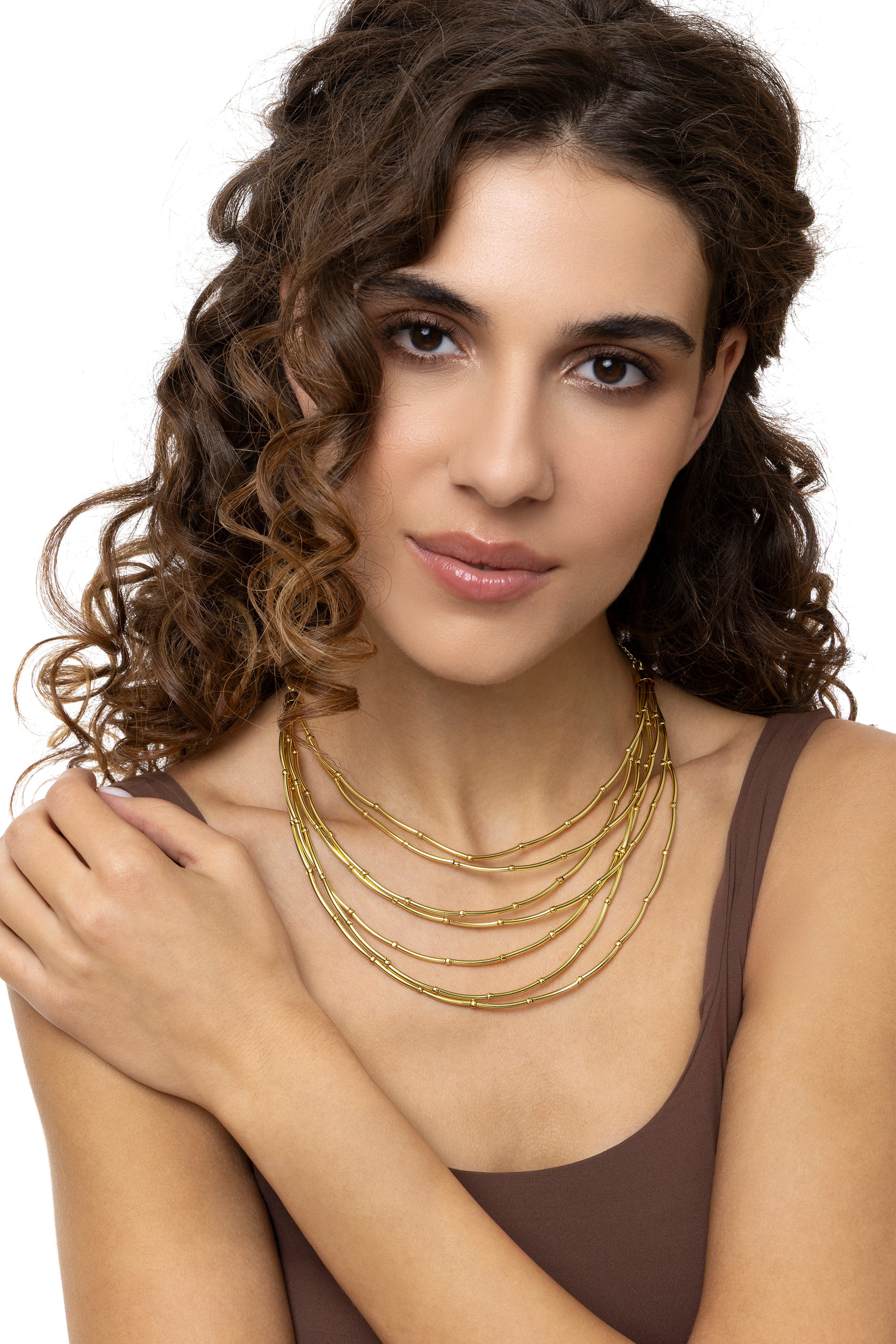 Un design composto da sette fili paralleli arricchiti da piccoli inserti sferici che scandiscono il ritmo del gioiello. Questa collana avvolge il d?collet? con un volume importante ma leggero, perfetto per chi cerca uno stile bold e ricercato. Lunghezza regolabile. Ottone riciclato. Handmade. Nickel tested.