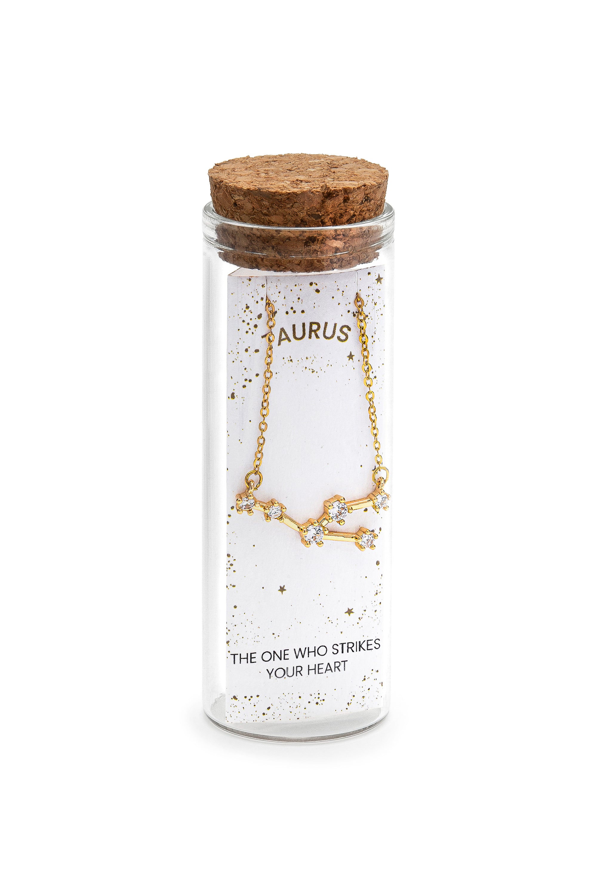 La collana Costellazione Toro in acciaio gold plated è gioiello che parla di te, donandoti luce e cosmo vibes. Le collane sono inserite in una glass bottle, insieme ad una frase che descrive il segno con dolcezza. Questa collana è un vero e proprio piece statement, personalizzato e di tendenza. La particolarità astrale del gioiello, lo rende un'idea Gift-Ready facile e originale. Chiusura a farfalla. Nickel tested. Lavorazione artigianale.