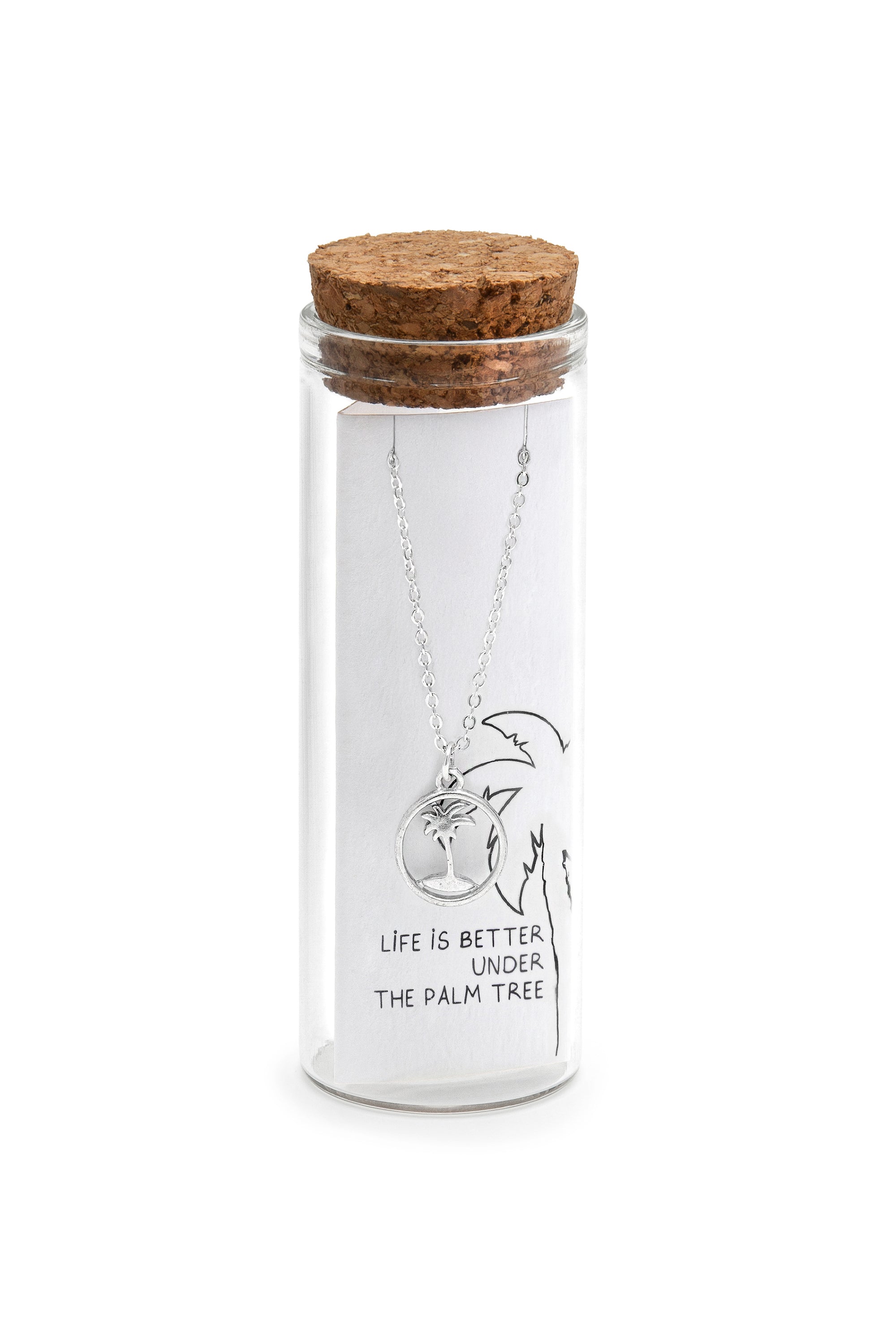 Il gioiello perfetto da regalare e regalarsi. Collana placcata in argento in argento a forma di palma con dedica Life is Better Under The Palm Tree. Le collane sono inserite in una iconica glass bottle e caratterizzati da una dedica funny vibes e piena d'affetto: un'idea Gift-Ready facile e originale. Chiusura a moschettone. Nickel tested. Lavorazione artigianale.