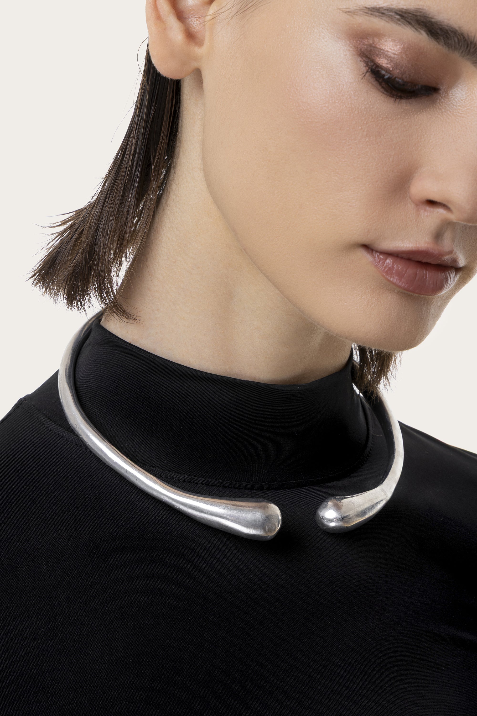Collana modello girocollo con terminali a goccia, realizzata in alluminio 100% riciclato. Design essenziale e moderno dalla texture smooth e brillante, perfetto per valorizzare il collo con un tocco minimal e audace. Nickel tested. Lavorazione artigianale. Gioielli fatti a mano, unici e artigianali, perfetti per tutti i tuoi look o come idea regalo.
