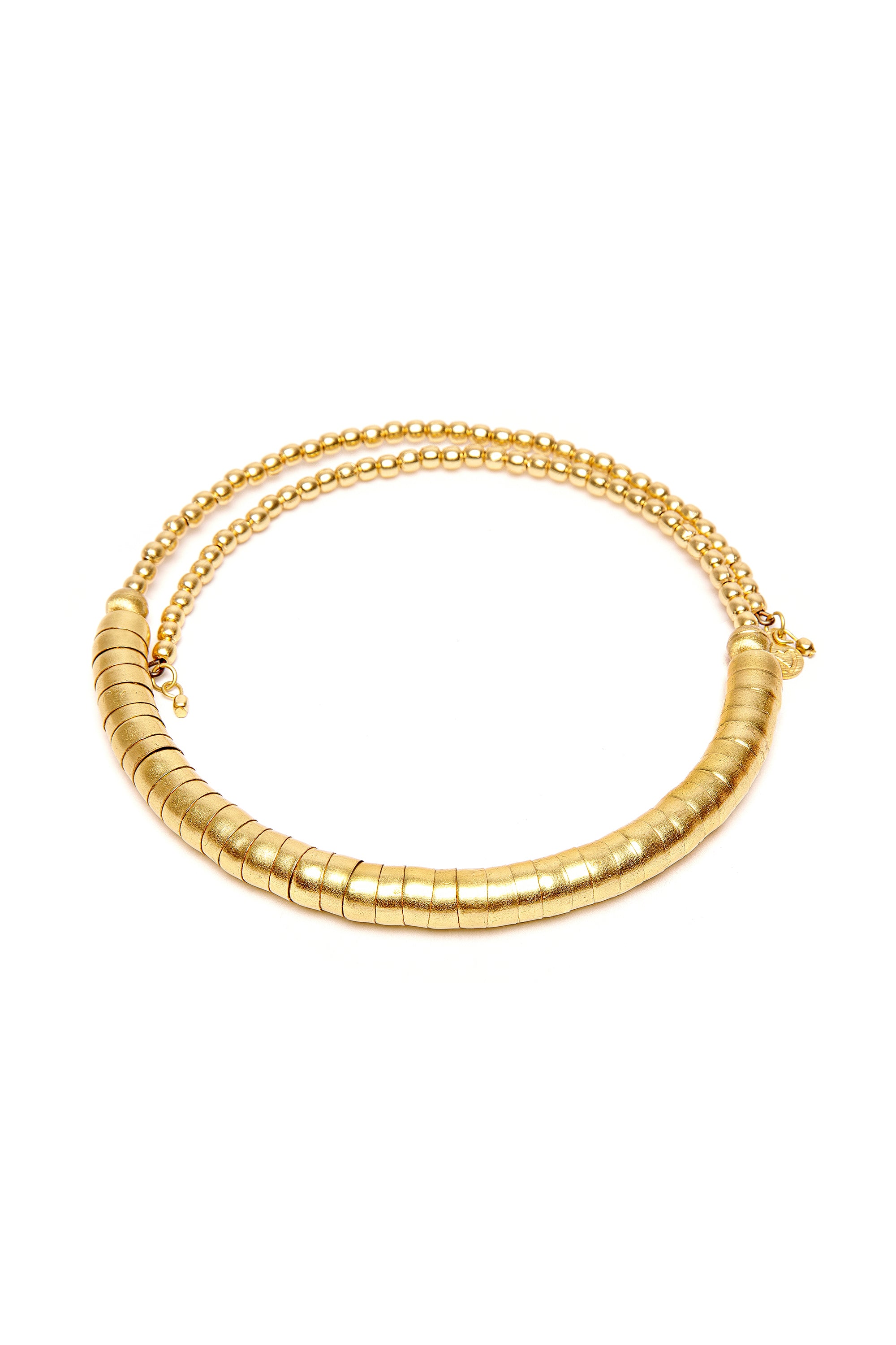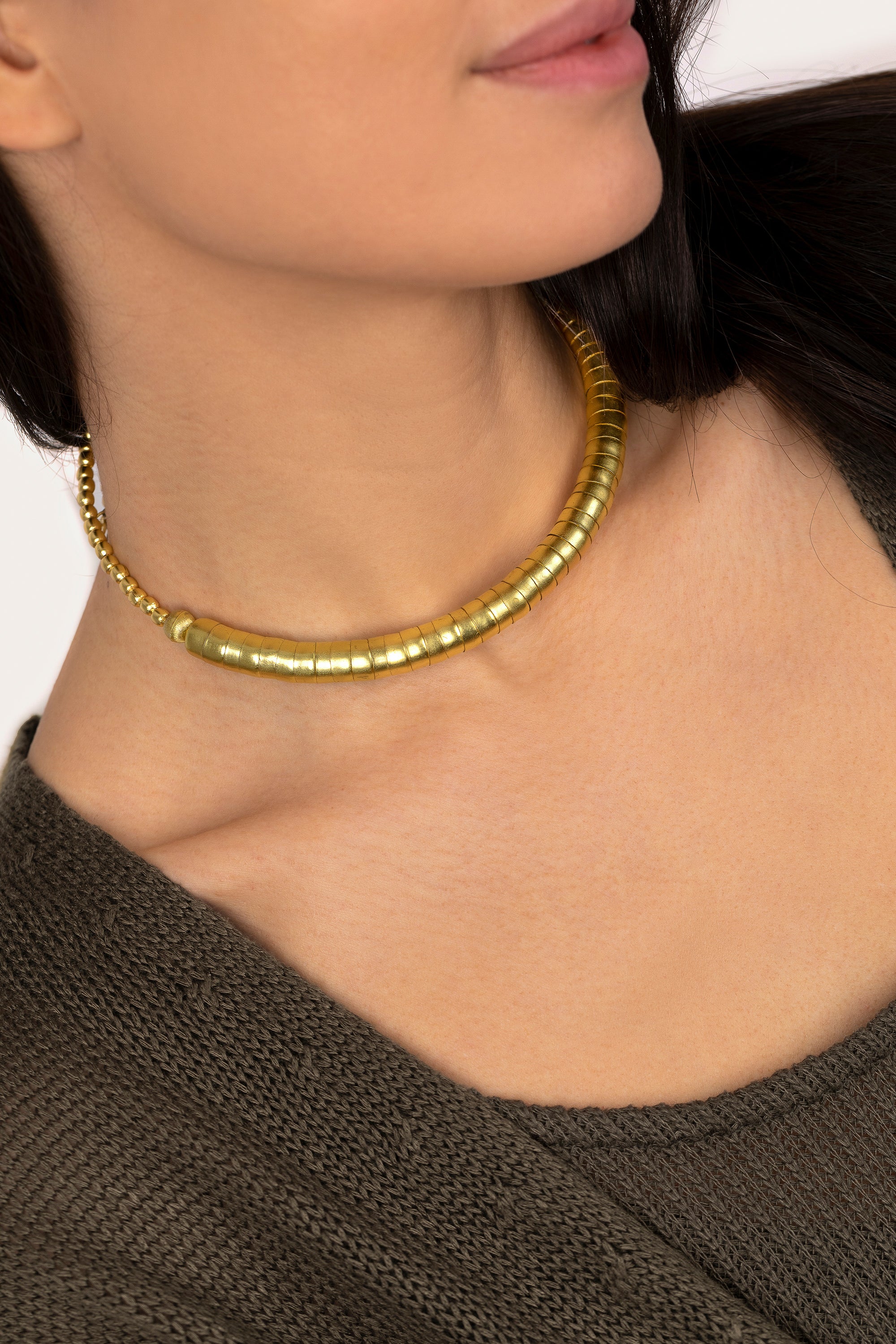 Girocollo scultoreo in ottone riciclato in stile snake skin, studiato per creare volume e luce attorno al collo; silhouette avvolgente ma leggera, chiusura con moschettone; ideale per elevare look minimal. Nickel tested. Lavorazione artigianale. Gioielli fatti a mano, unici e artigianali, perfetti per tutti i tuoi look o come idea regalo.