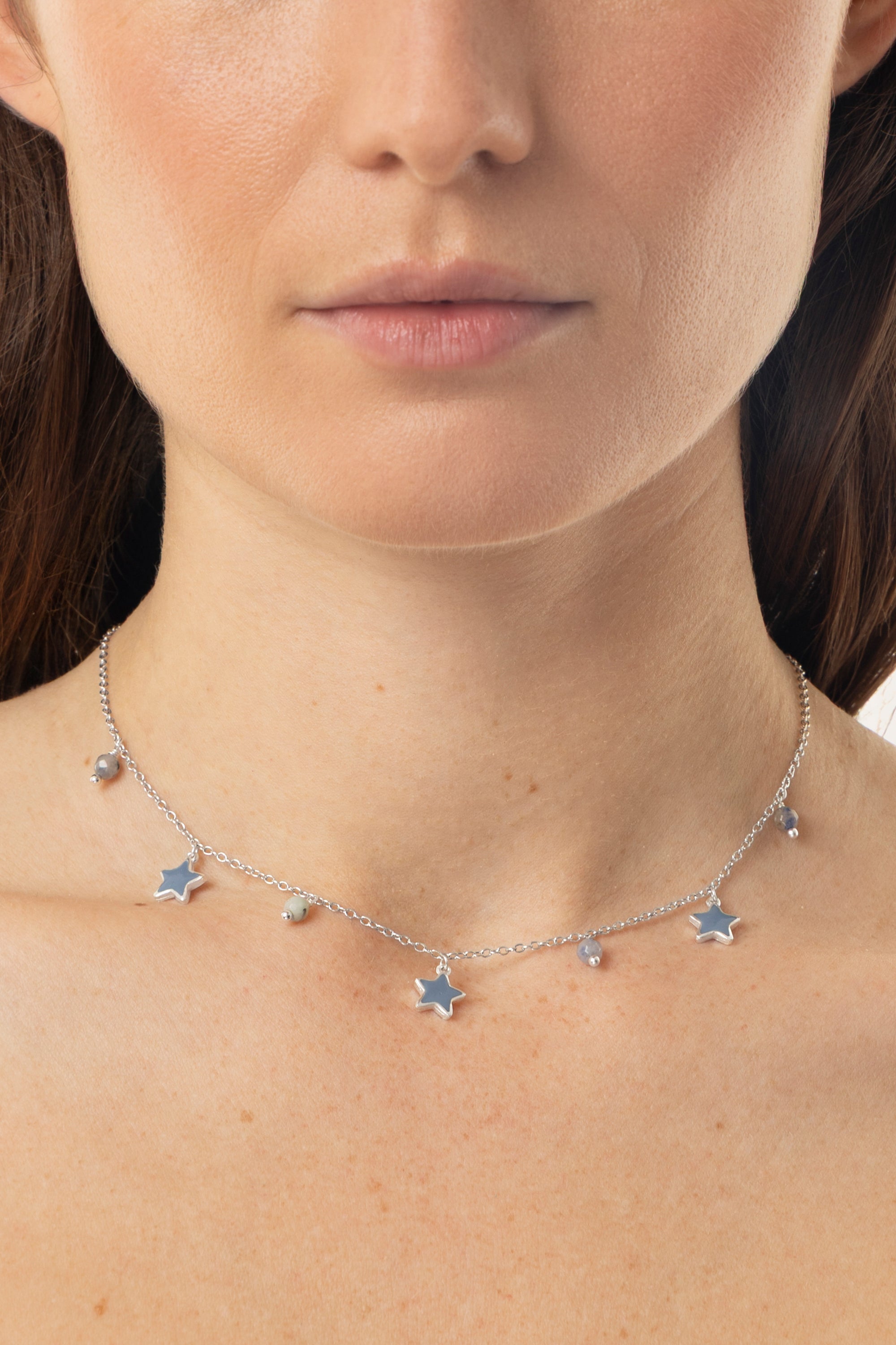 Un design sky inspired prende forma in questo girocollo etereo, ornato da una costellazione di stelline blu in movimento. Perfetto per chi desidera un accessorio femminile dall’aspetto magico, capace di impreziosire il décolleté con leggerezza e charms di tendenza. Lunghezza collana 38 cm. Lunghezza extra chain 8 cm. Materiale: placcatura argento 100% artigianale. Nickel tested. Lavorazione artigianale. Gioielli fatti a mano, unici e artigianali, perfetti per tutti i tuoi look o come idea regalo.