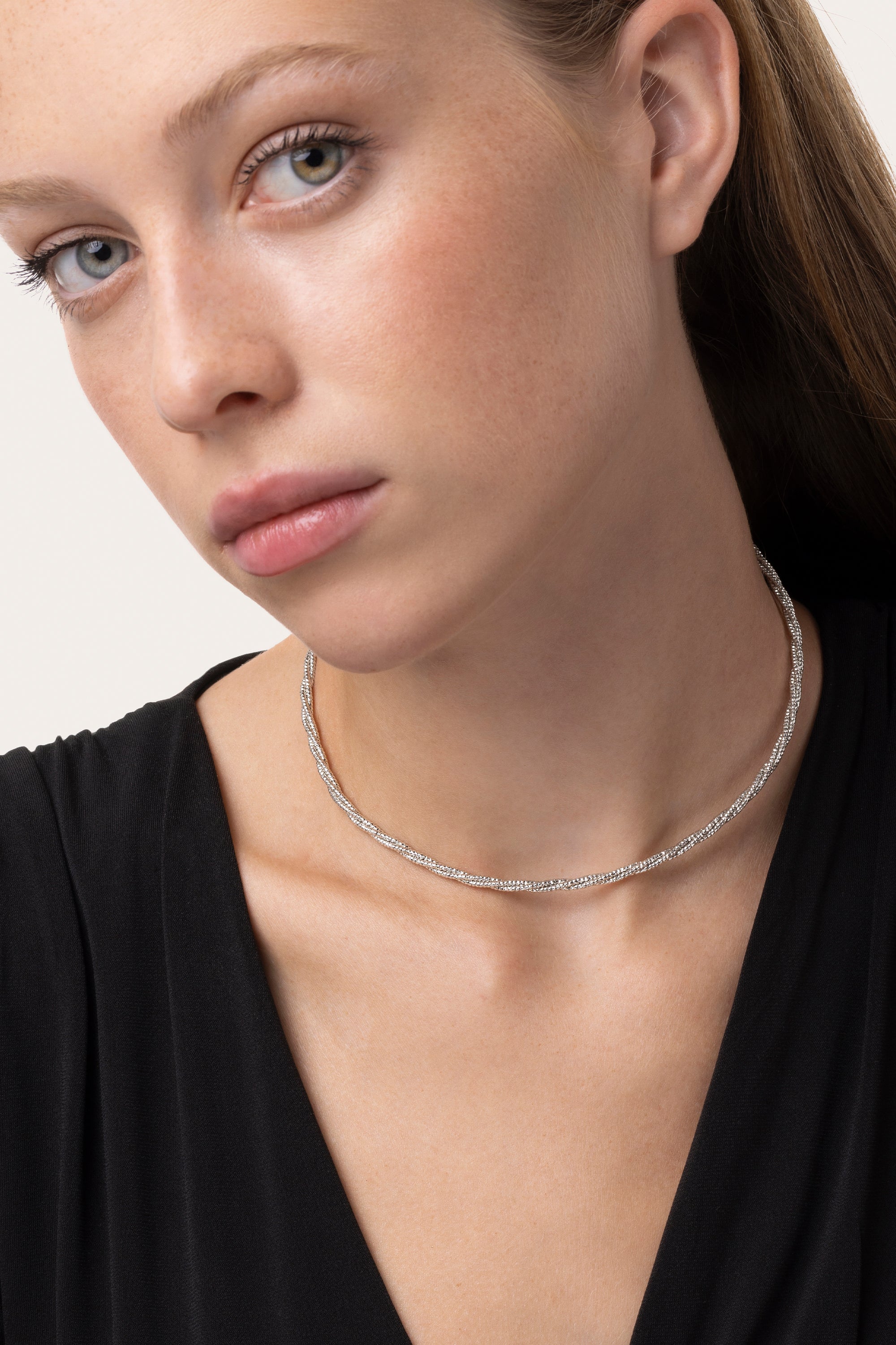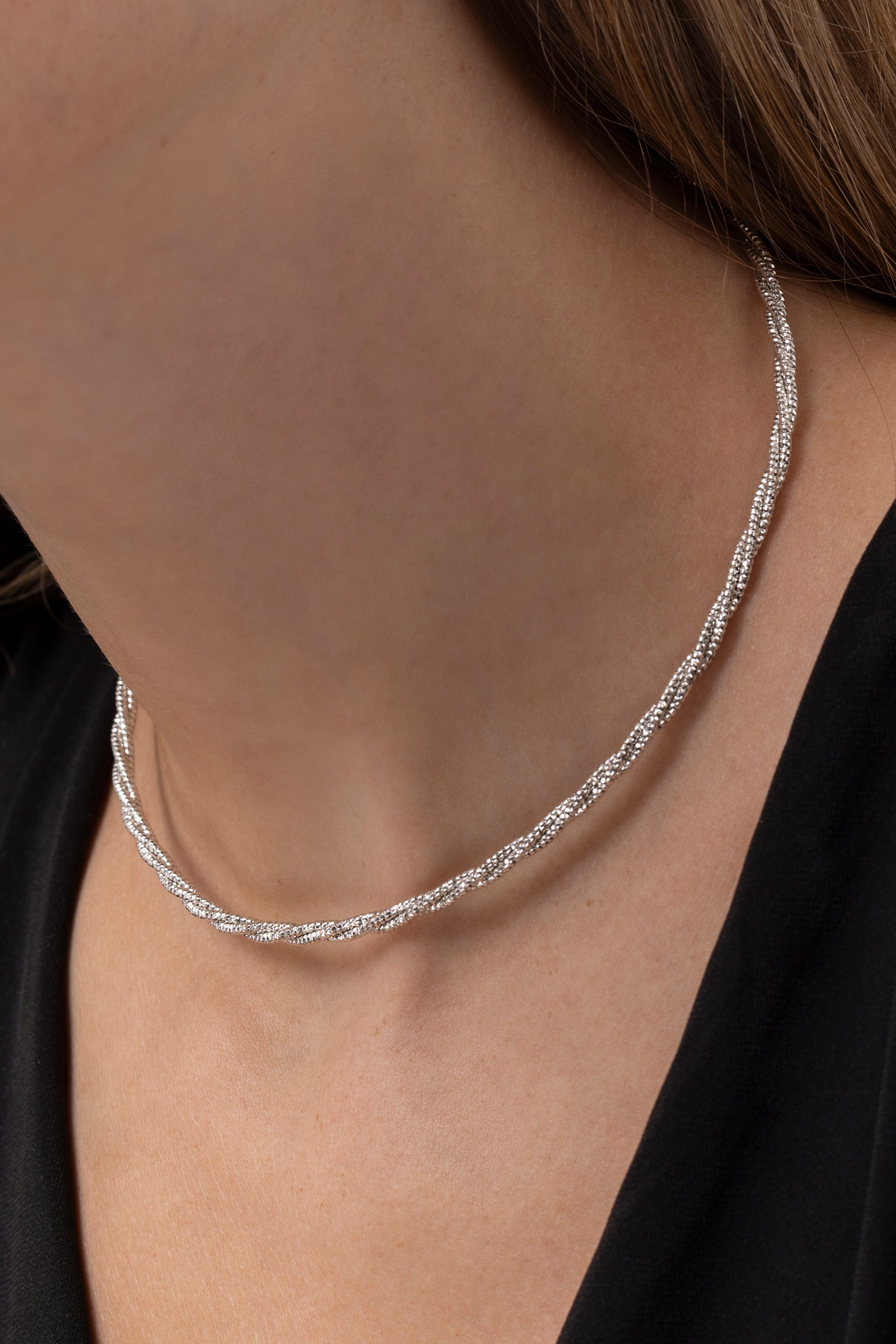 Girocollo aperto regolabile con filo intrecciato a mano effetto torchon. Il design della collana è artigianale e leggero, da abbinare alle tue preferite per un effetto multilayer. Placcato in argento. Nickel tested. Gioielli fatti a mano, unici e artigianali, perfetti per tutti i tuoi look o come idea regalo.