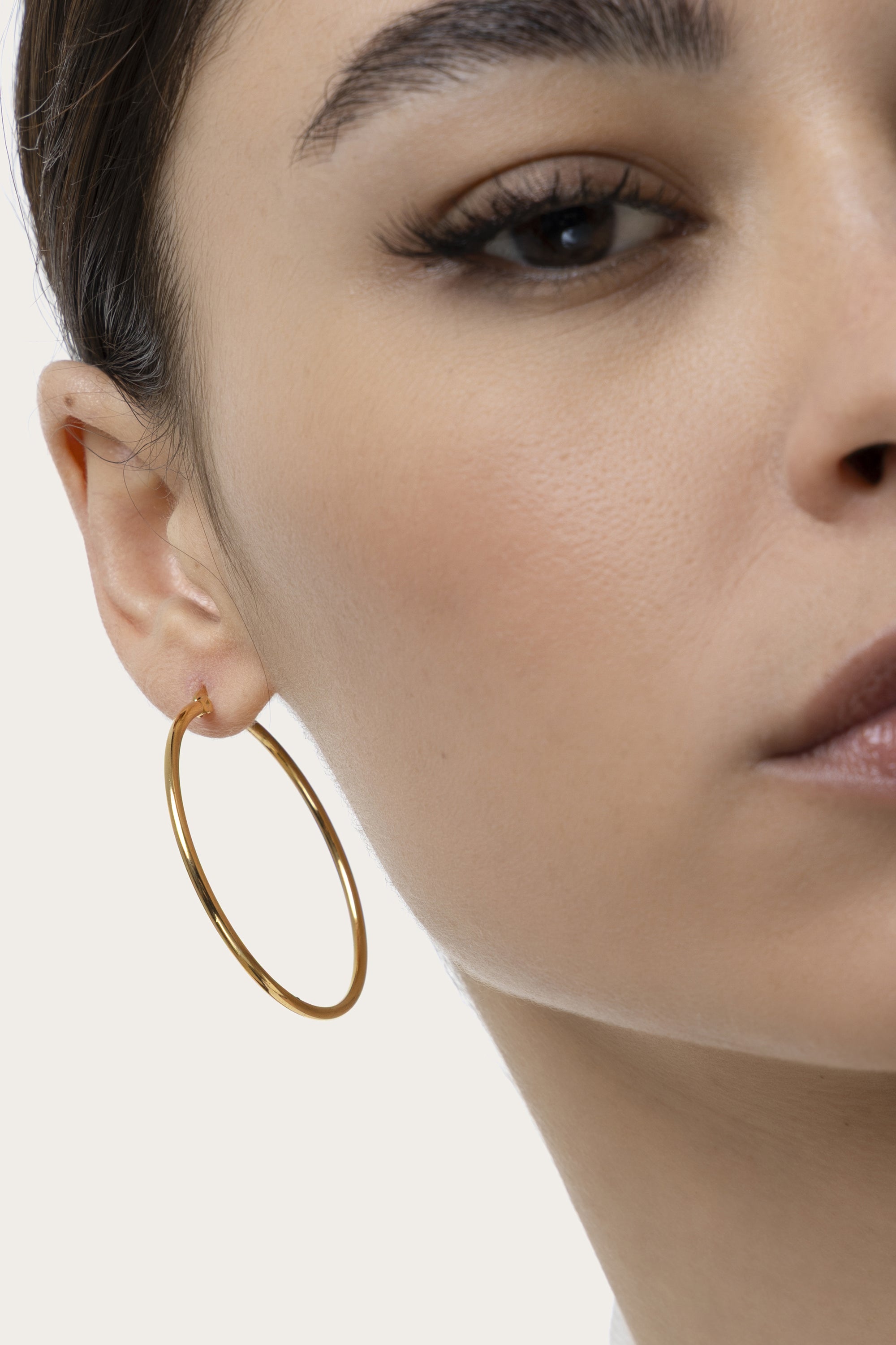 Orecchini a cerchio in acciaio gold plated modello hoops medi. Cerchi minimal dal profilo sottile e luminoso, ideali da indossare da soli oppure da mixare in earrings stack eleganti e senza tempo. Chiusura a baionetta. Diametro 4 cm. Nickel tested.