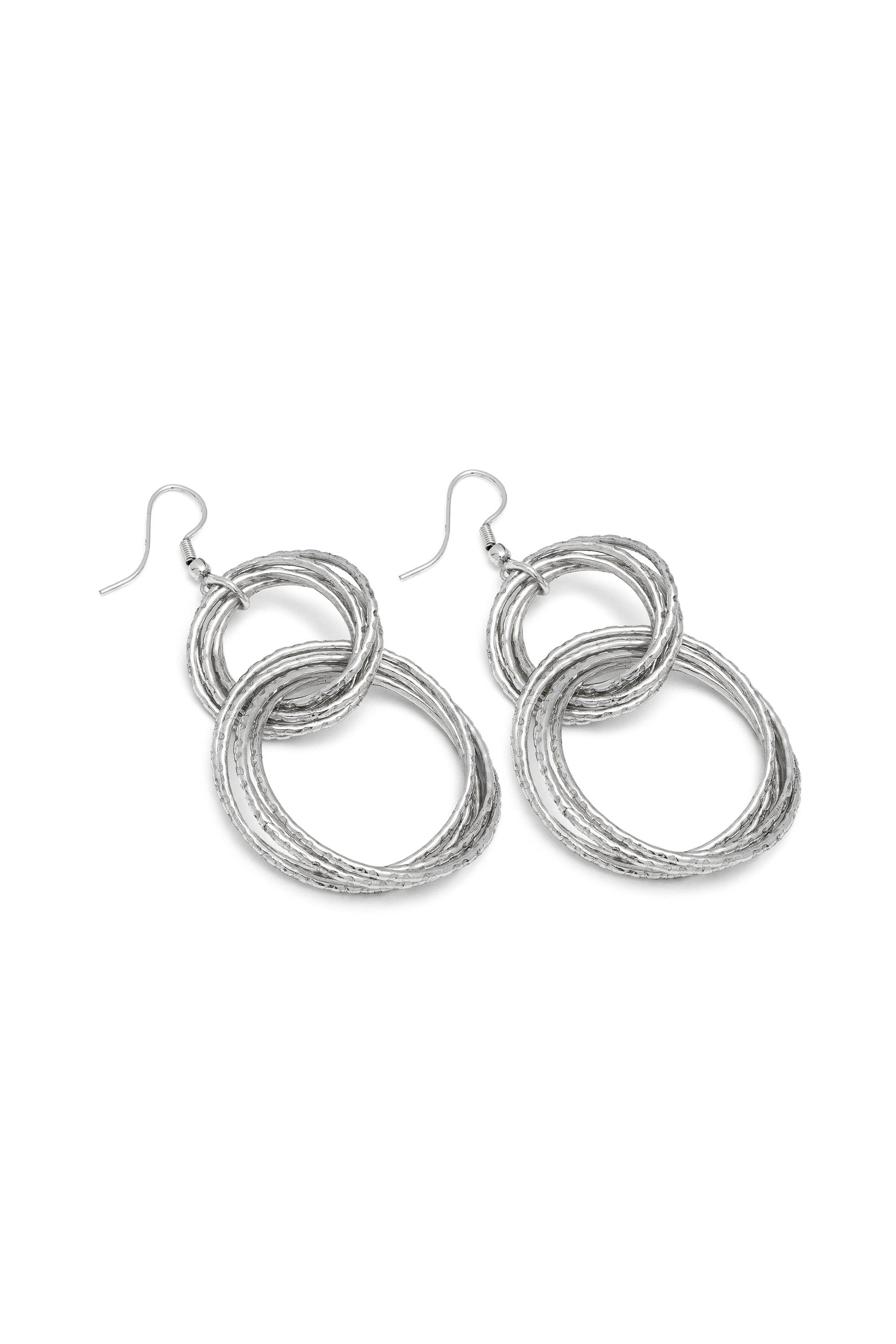 Orecchini pendenti a cerchi multipli martellati, riflessi irregolari che catturano la luce con eleganza. Ideali per completare look da cerimonia o per dare luminosità al daily wear. Placcatura argento 100% artigianale. Nickel tested. Lavorazione artigianale. Gioielli fatti a mano, unici e artigianali, perfetti per tutti i tuoi look o come idea regalo.