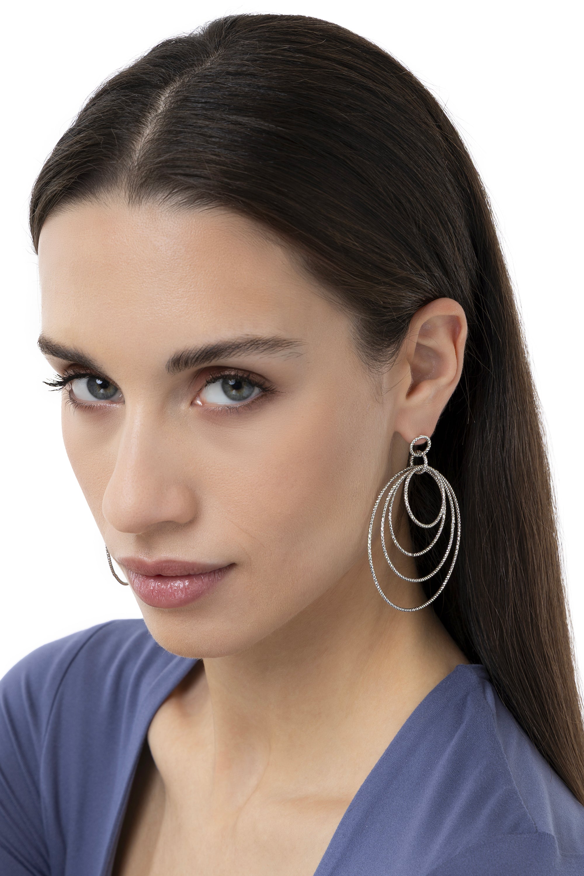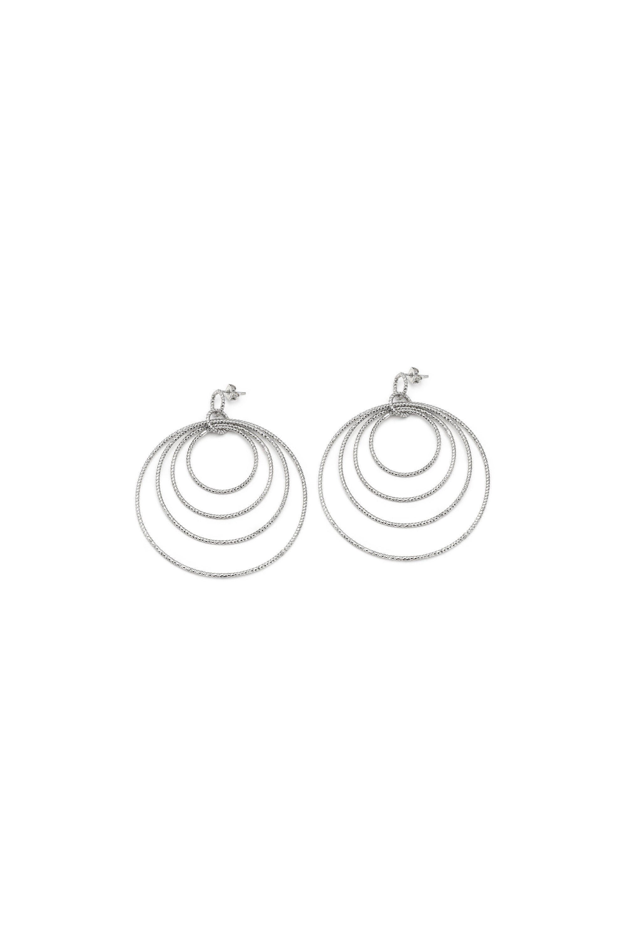 Geometrie leggere e stile contemporaneo. Questi orecchini sono caratterizzati da cerchi concentrici di dimensioni diverse dalla texture finemente lavorata che dona luce a ogni movimento. Il gioco di sovrapposizioni crea un effetto dinamico, rendendoli l'accessorio perfetto per completare i tuoi look serali. Diametri cerchi 6 cm, 4,5 cm, 3,5 cm e 2,5 cm. Chiusura a perno con farfallina. Placcatura argento. Nickel tested.