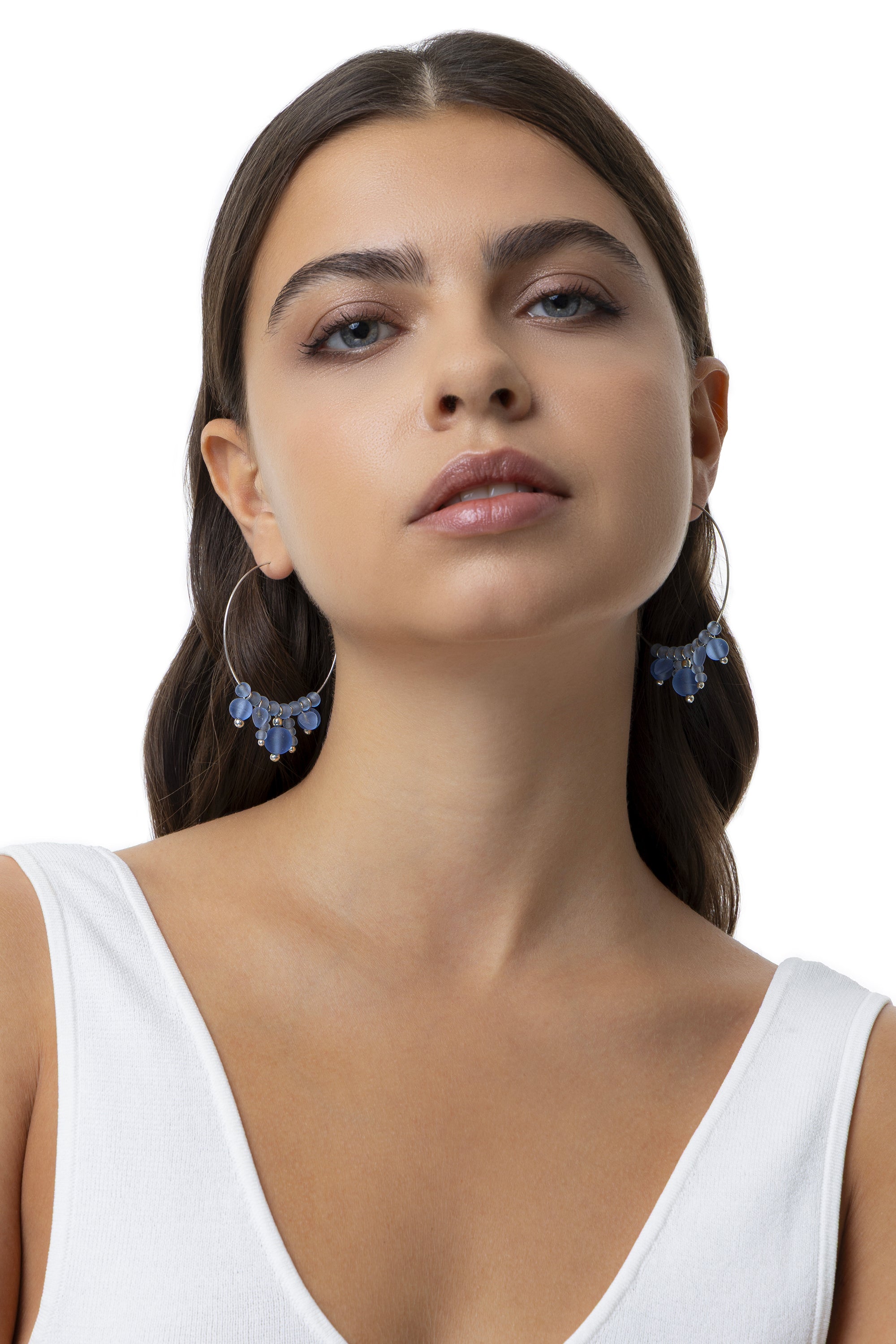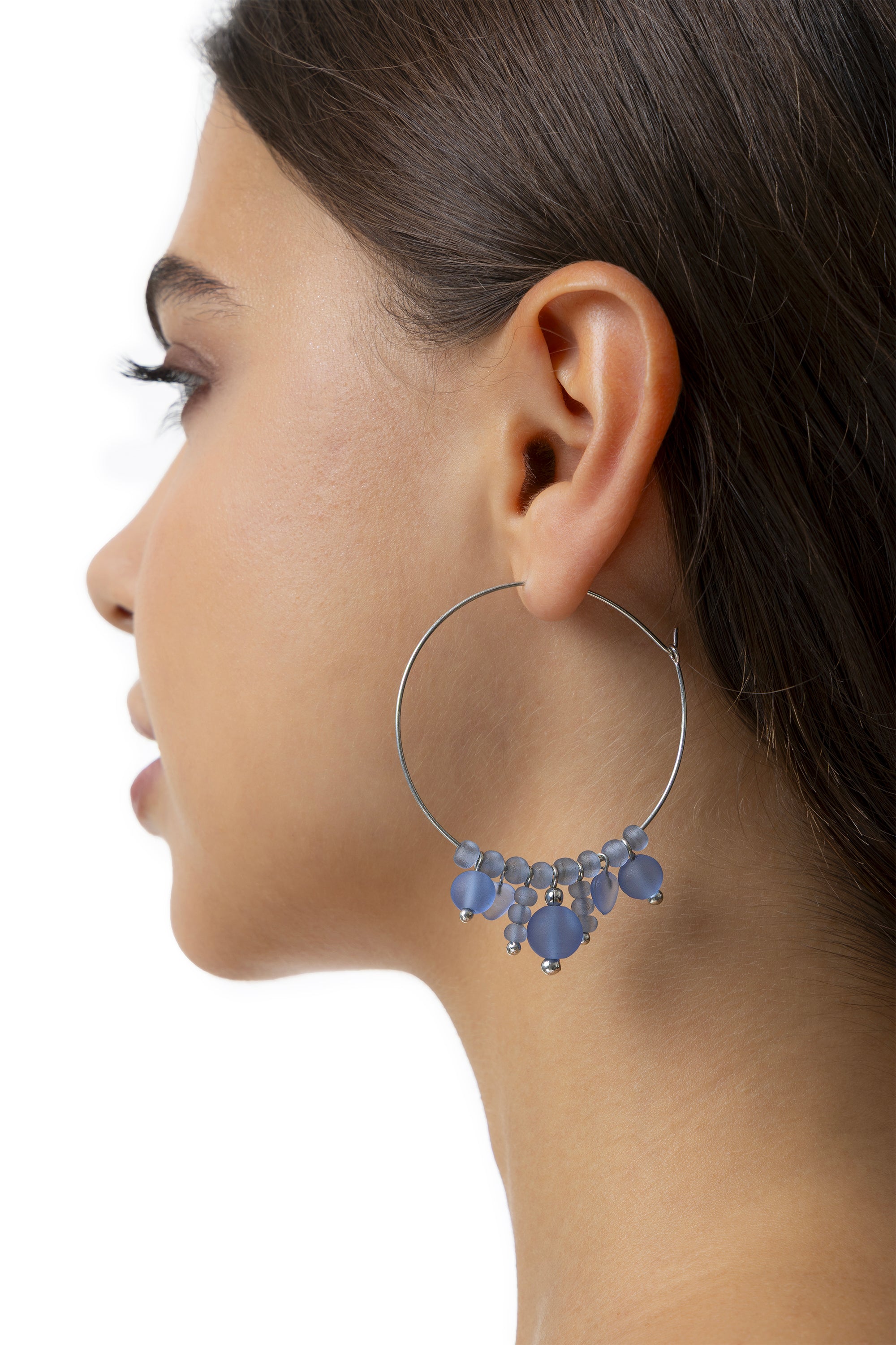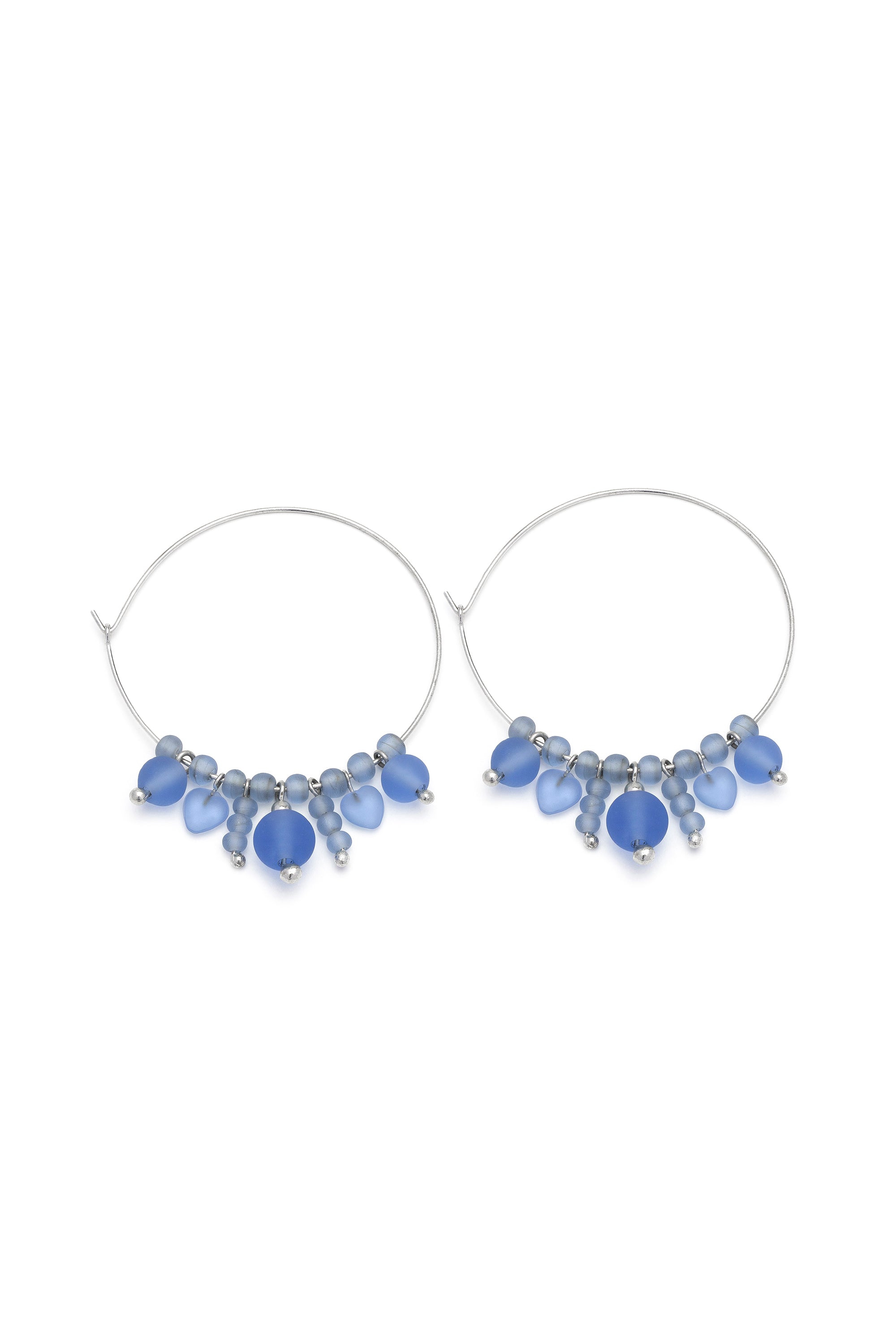 Orecchini a cerchio impreziositi da una composizione a grappolo di sfere e cuori nelle sfumature del turchese. La finitura opaca del materiale e la disposizione armoniosa degli elementi pendenti donano al gioiello uno stile essenziale, moderno e solare. Realizzati in vetro 100% riciclato e rifiniti con dettagli in placcatura argento, sono l'accessorio perfetto per chi cerca un design leggero e di carattere. Diametro 4,5 cm. Chiusura ad incastro. Nickel tested.