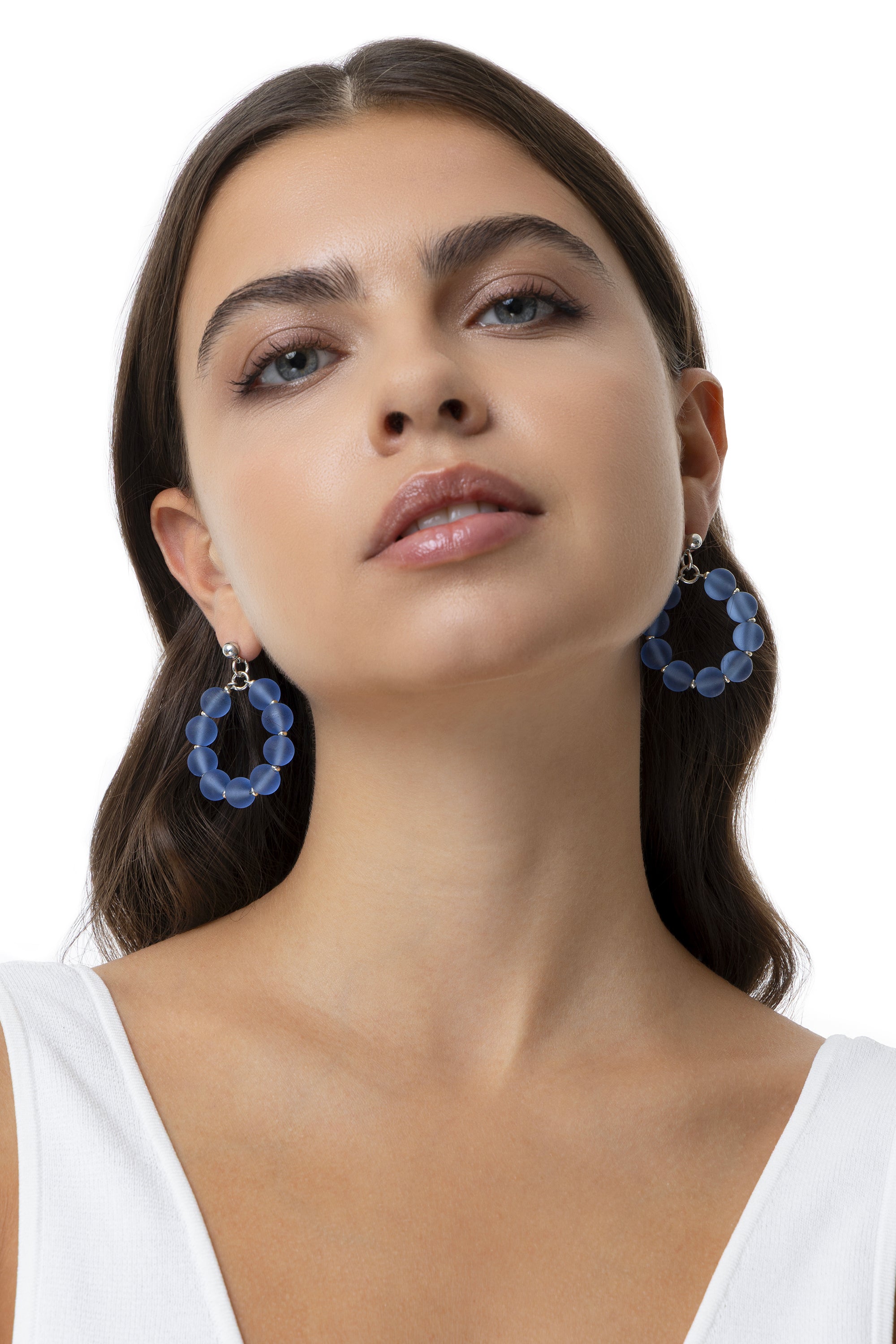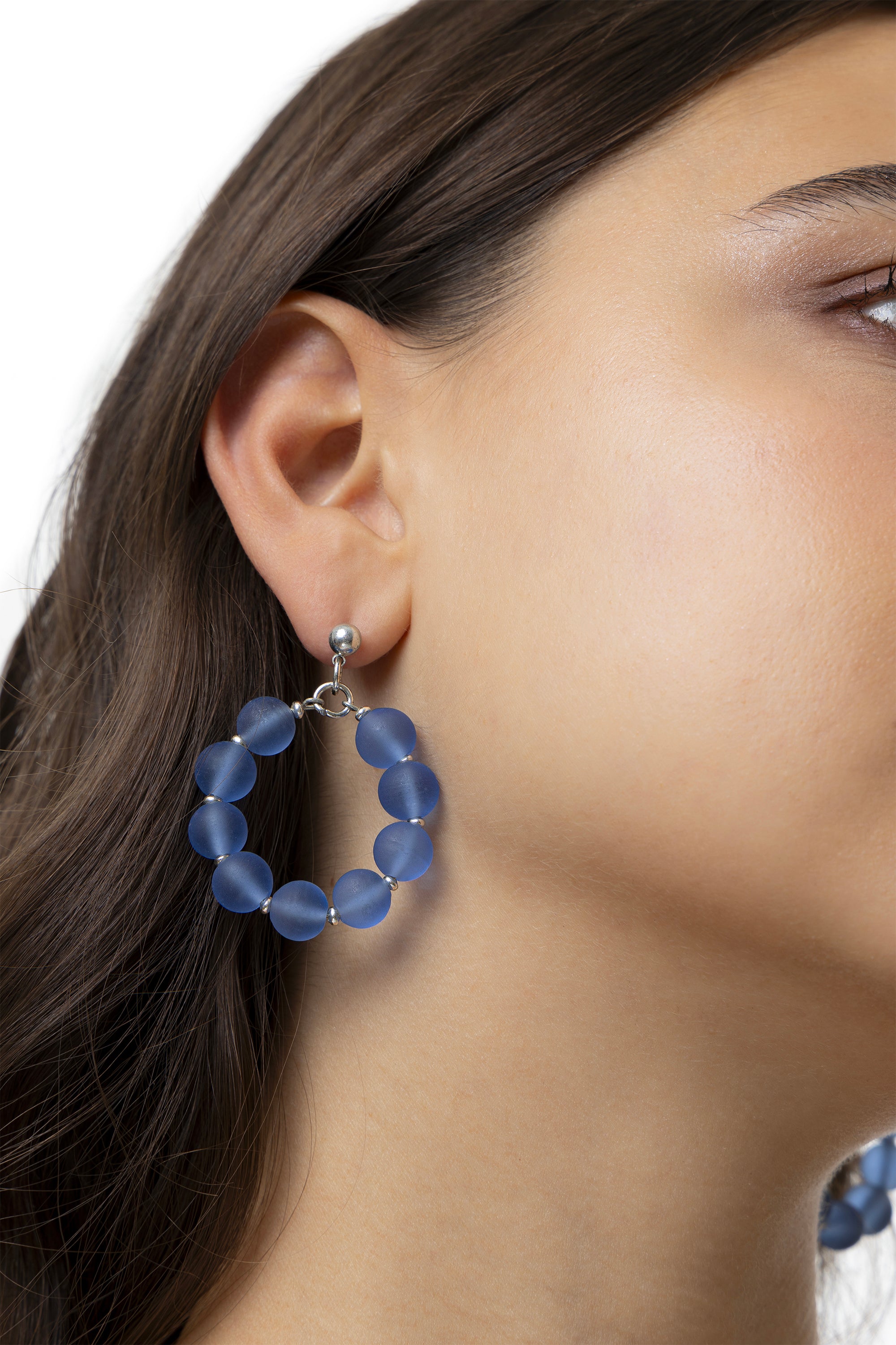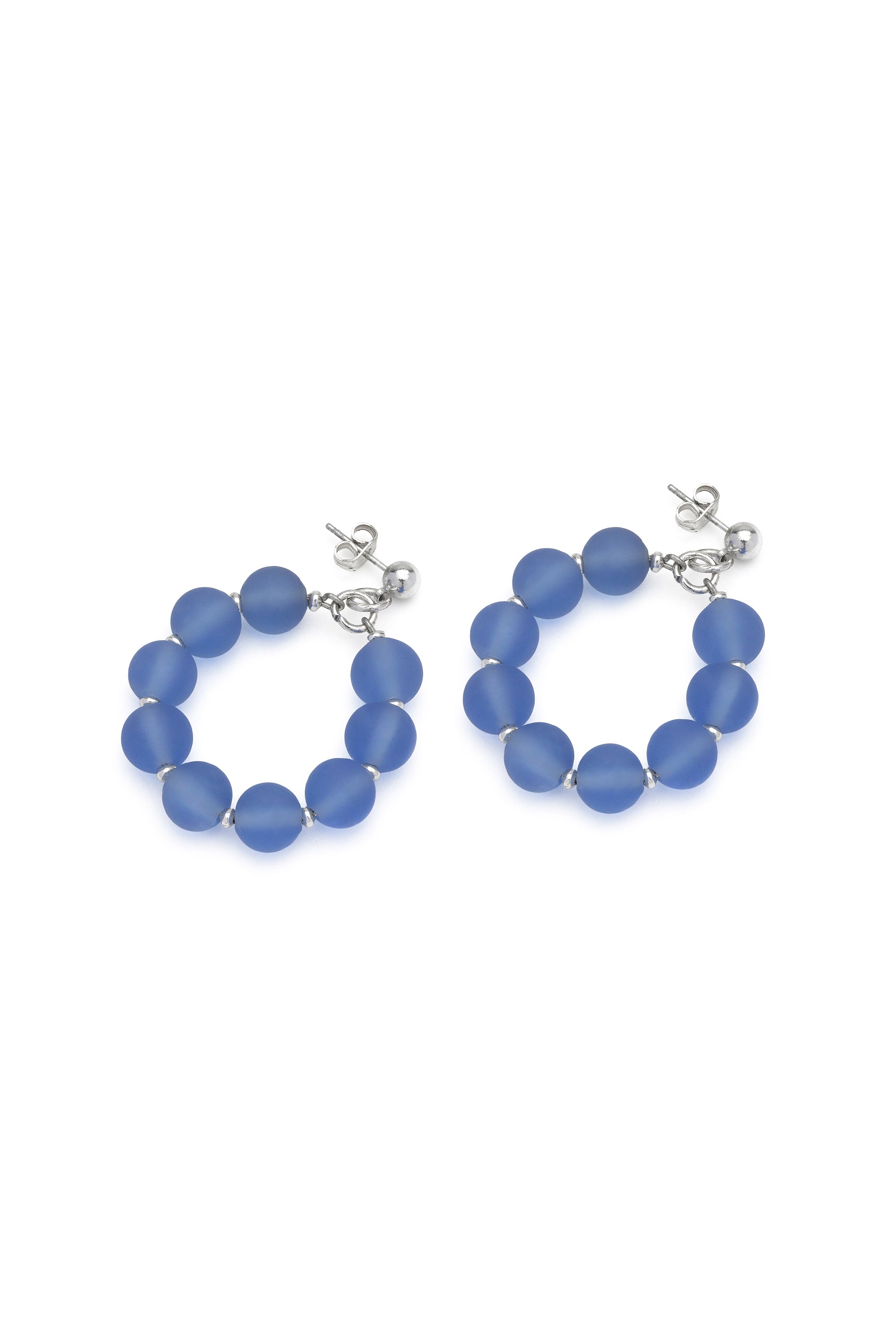 Orecchini a cerchio di medie dimensioni con una sequenza di sfere turchesi, intervallate da micro dettagli placcati argento. La finitura opaca del materiale e il design geometrico pulito donano al gioiello uno stile essenziale, moderno e solare. Realizzati in vetro 100% riciclato, questi orecchini offrono un movimento fluido e leggero, perfetto per i look primaverili. Diametro 3,5 cm. Chiusura a perno con farfallina. Nickel tested.