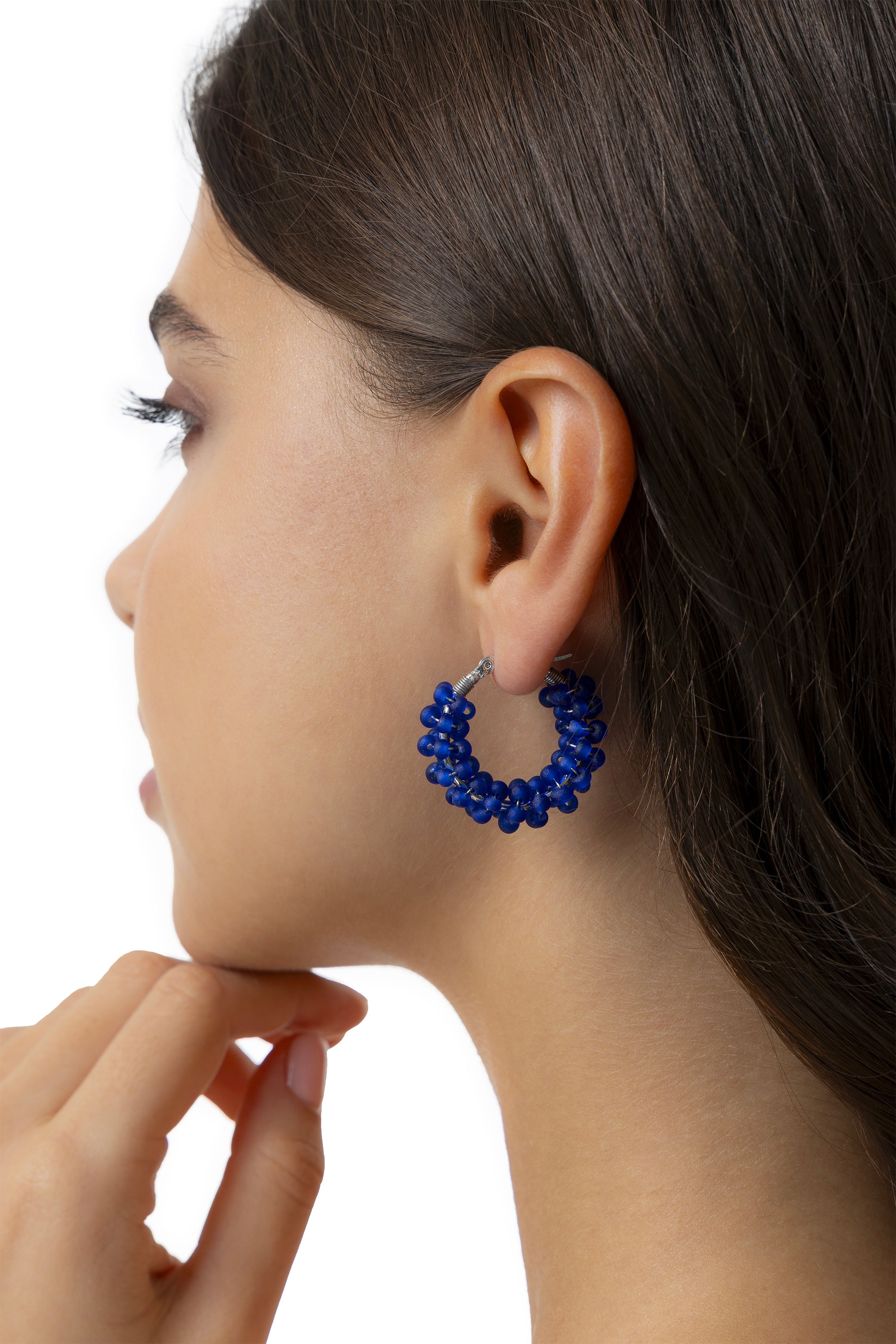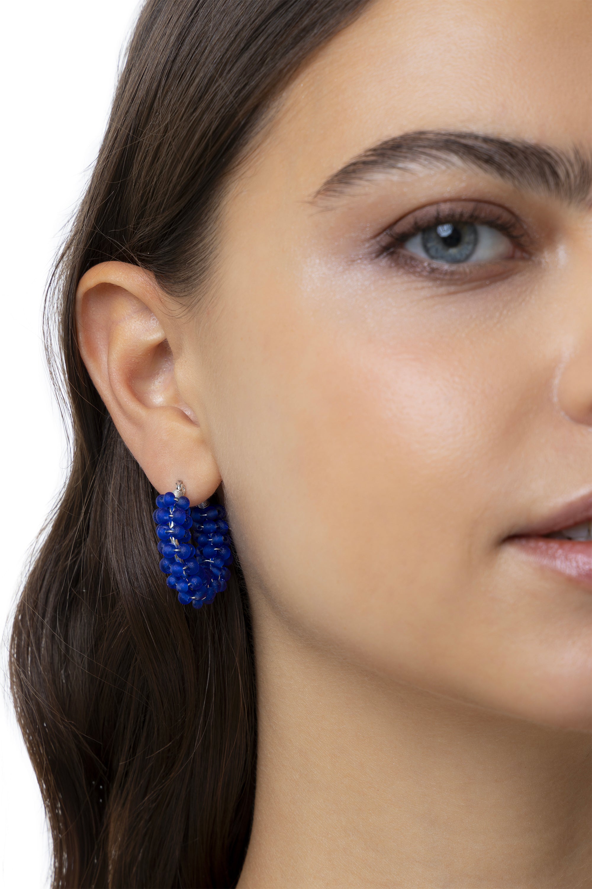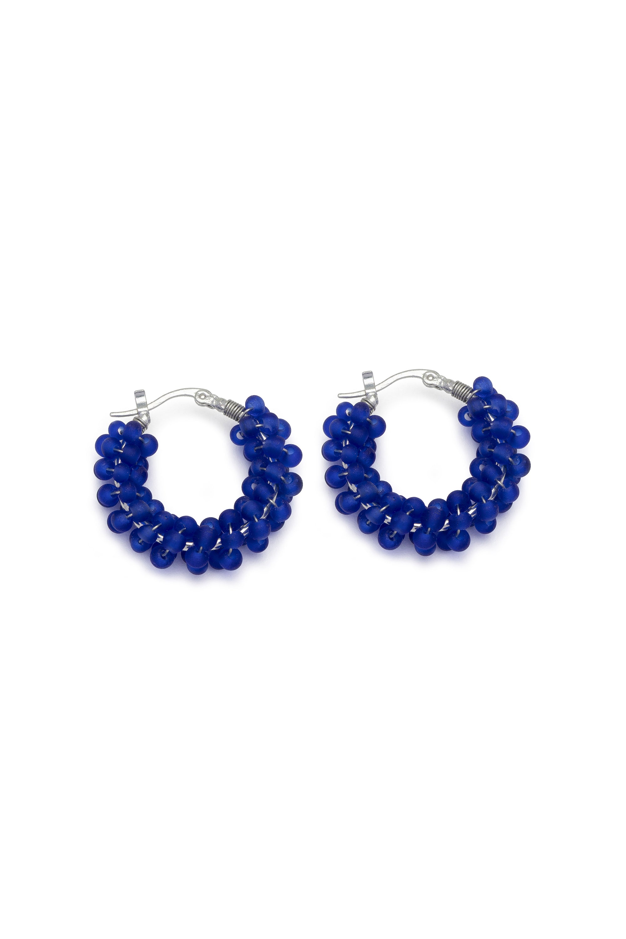 Orecchini a cerchietto, interamente rivestiti da una fitta trama di piccole sfere blu. La finitura opaca del materiale e il design compatto e bombato donano al gioiello uno stile essenziale, moderno e versatile. Realizzati in vetro 100% riciclato, sono l'accessorio perfetto per chi cerca un punto luce colorato e discreto, ideale da indossare tutti i giorni grazie alla loro estrema leggerezza. Diametro 3,5 cm. Chiusura a baionetta. Nickel tested.