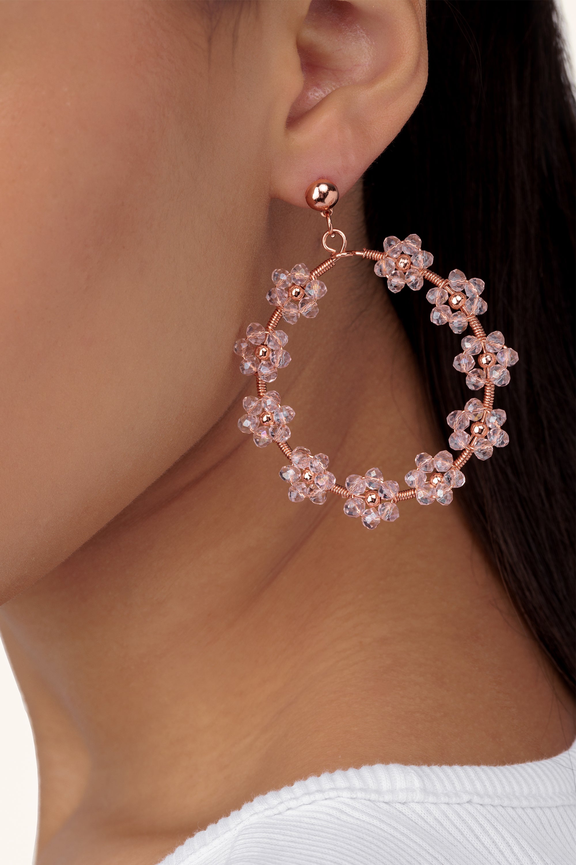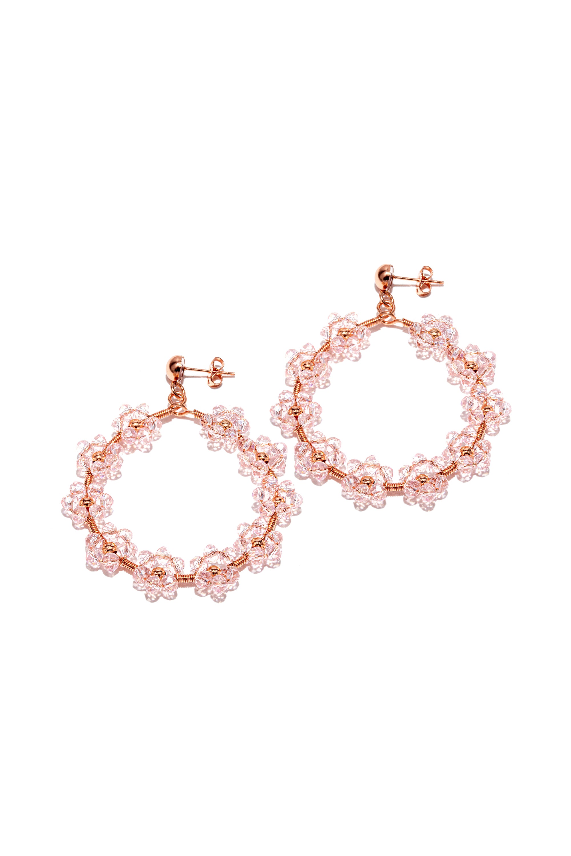 Orecchini copper plated a cerchio decorati da piccoli fiori di cristallo rosa cipria diamond cut che disegnano una ghirlanda luminosa. Romantici e scenografici, perfetti per illuminare il viso. Chiusura: perno con farfallina. Nickel tested. Lavorazione artigianale. Gioielli fatti a mano, unici e artigianali, perfetti per tutti i tuoi look o come idea regalo.