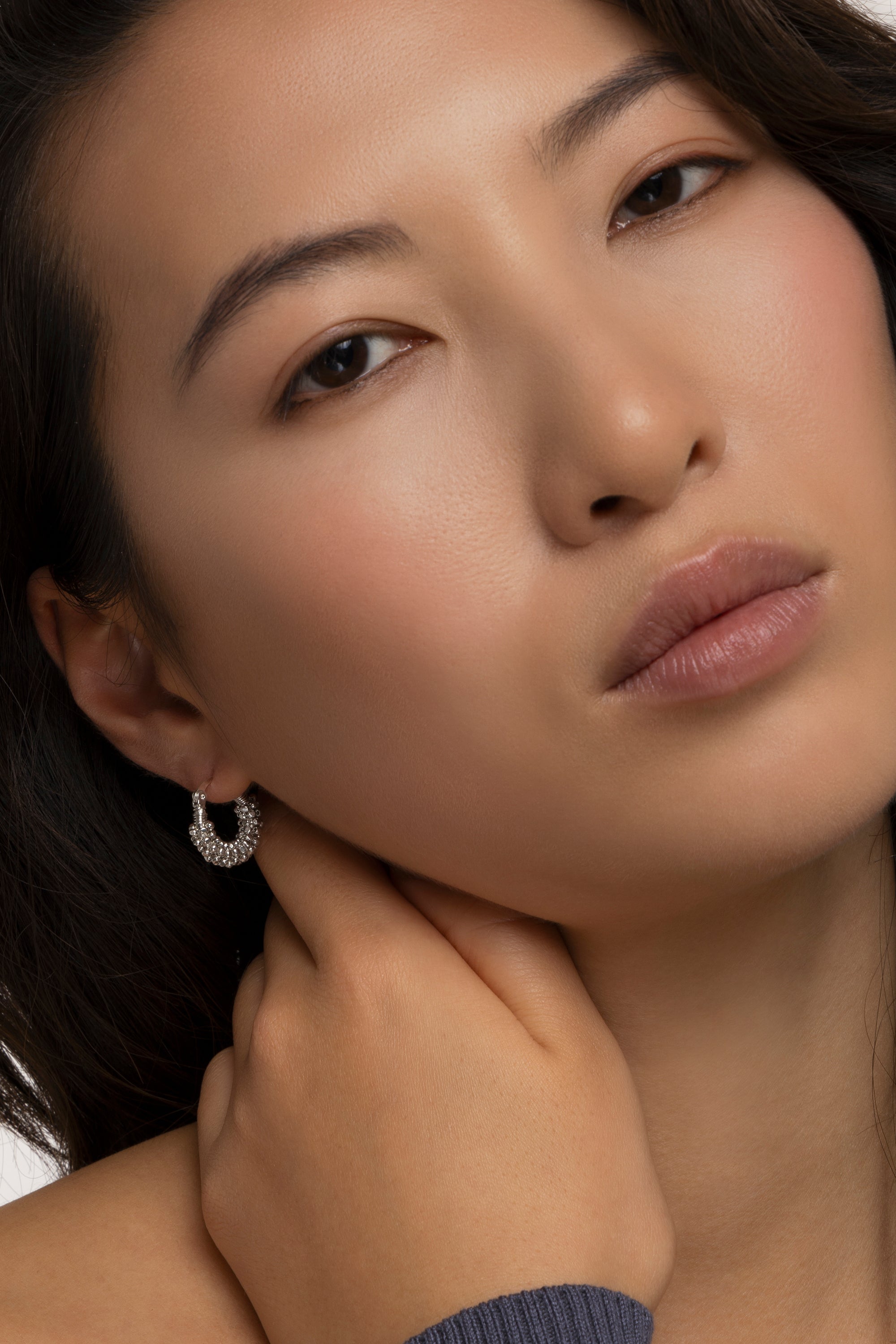 Cerchietti compatti rivestiti da piccoli cluster intrecciati ispirati al gelsomino: luminosi, leggeri e versatili, da indossare in stack con ear cuff o micro hoop lisci. Chiusura a baionetta. Placcatura argento 100% artigianale. Nickel tested. Lavorazione artigianale. Gioielli fatti a mano, unici e artigianali, perfetti per tutti i tuoi look o come idea regalo.