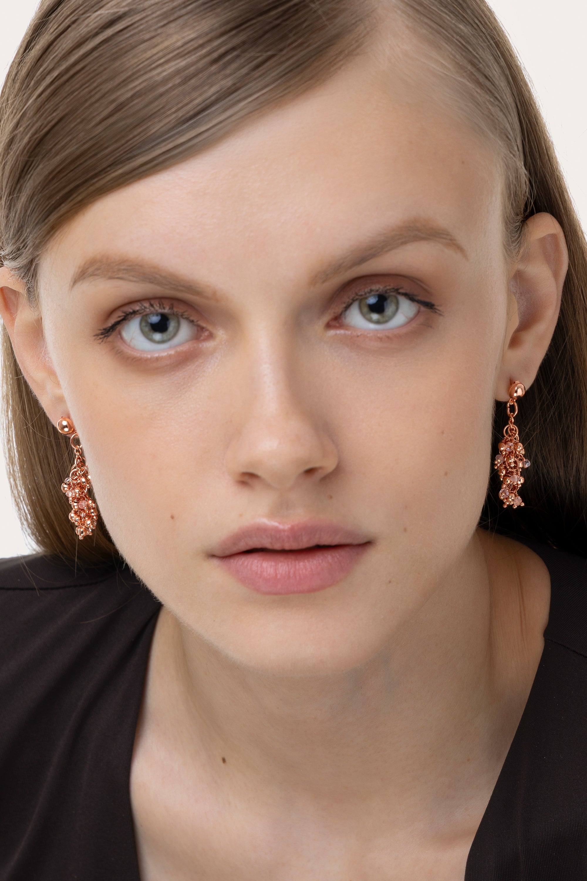 Orecchini pendenti copper plated a grappolo. I cristalli in vetro color cipria aggiungono un tocco ragginati alle micro sfere placcate rame, per un cluster brillante e artigianale. Chiusura a farfalla. Misura 4 cm. Gioielli fatti a mano, unici e artigianali, perfetti per tutti i tuoi look o come idea regalo. Nickel tested.