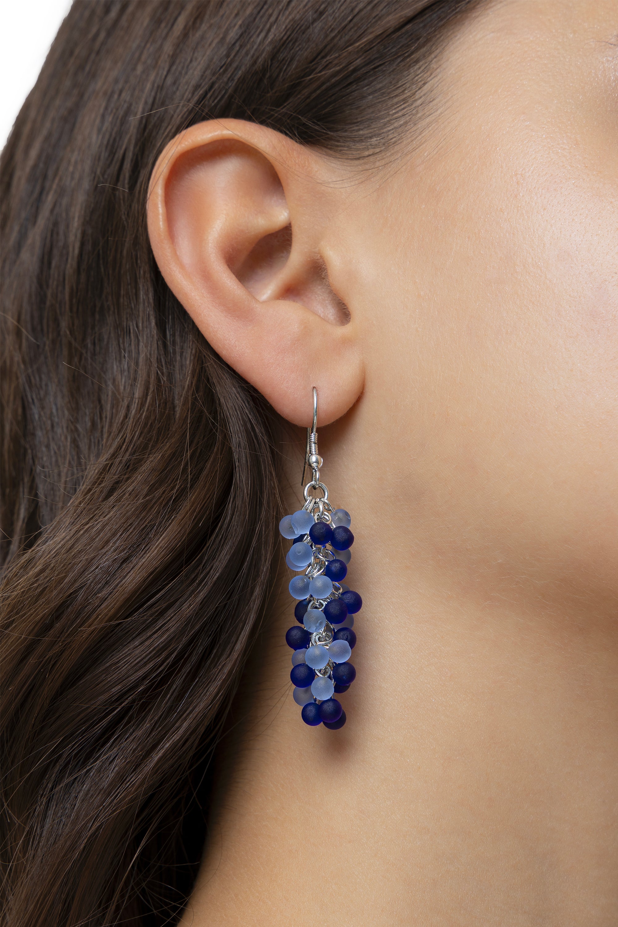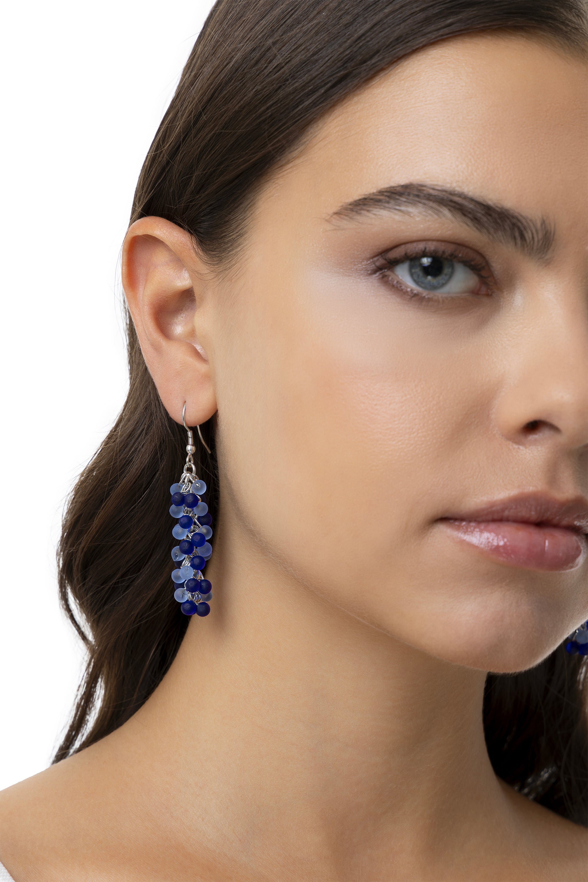 Orecchini pendenti caratterizzati da una ricca lavorazione a grappolo composta da piccole sfere blu e turchesi. La finitura opaca del materiale e il design dinamico della struttura Mogra donano al gioiello uno stile essenziale, moderno e di grande raffinatezza. Realizzati in vetro 100% riciclato, questi orecchini offrono un movimento fluido e un gioco di sfumature marine unico, ideale per illuminare il volto con eleganza. Lunghezza 4 cm. Chiusura ad amo. Nickel tested.