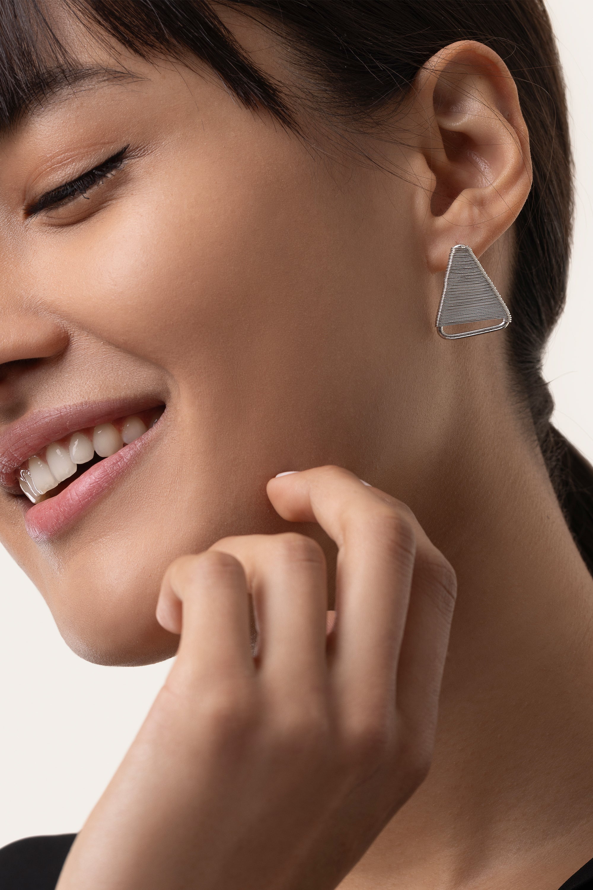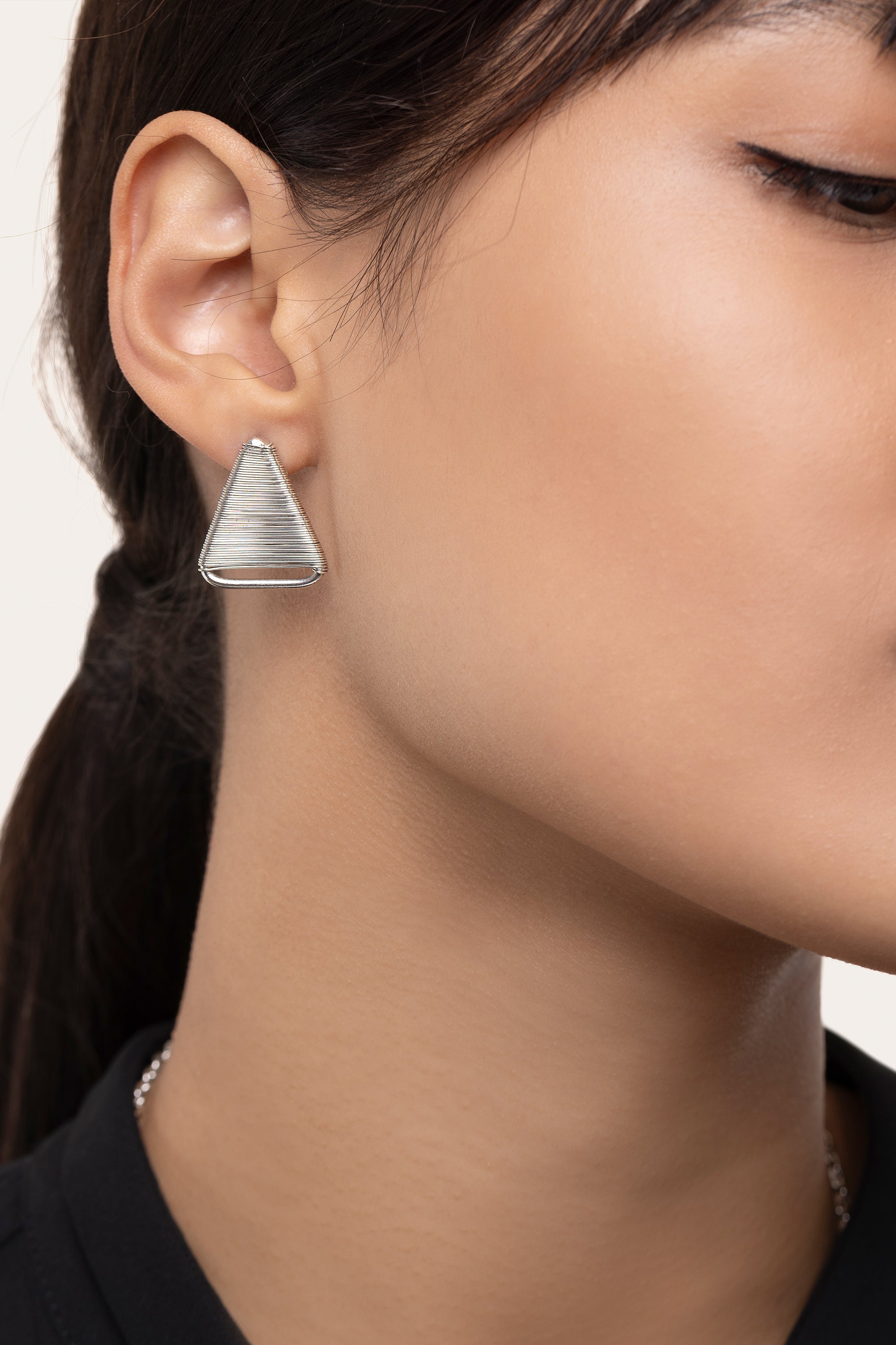 Orecchini triangolo con filo sottile lavorato a mano per un effetto elegante e compatto. Misura 2,5 cm circa. Chiusura a farfalla. Placcato in argento. Nickel tested. Gioielli fatti a mano, unici e artigianali, perfetti per tutti i tuoi look o come idea regalo.