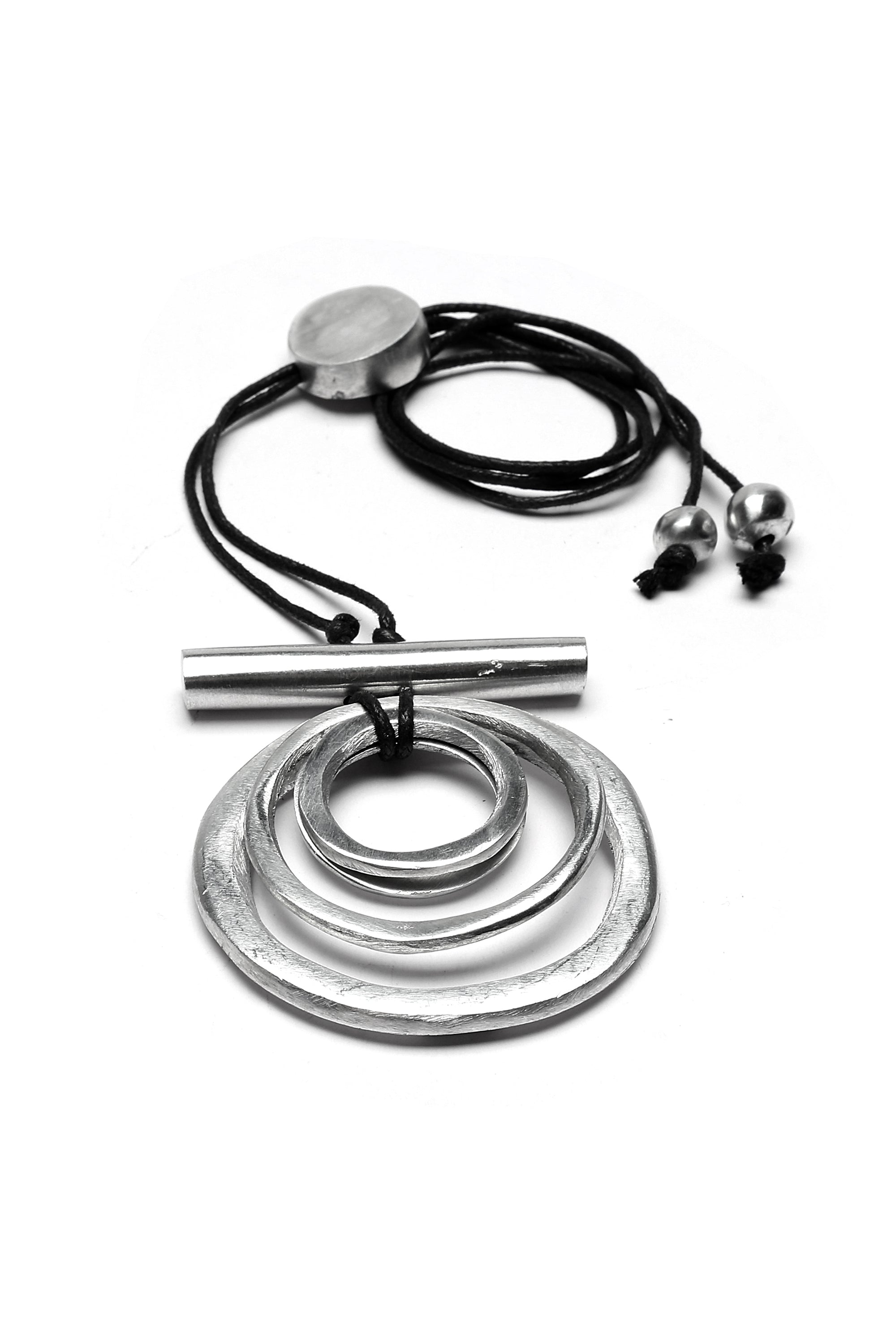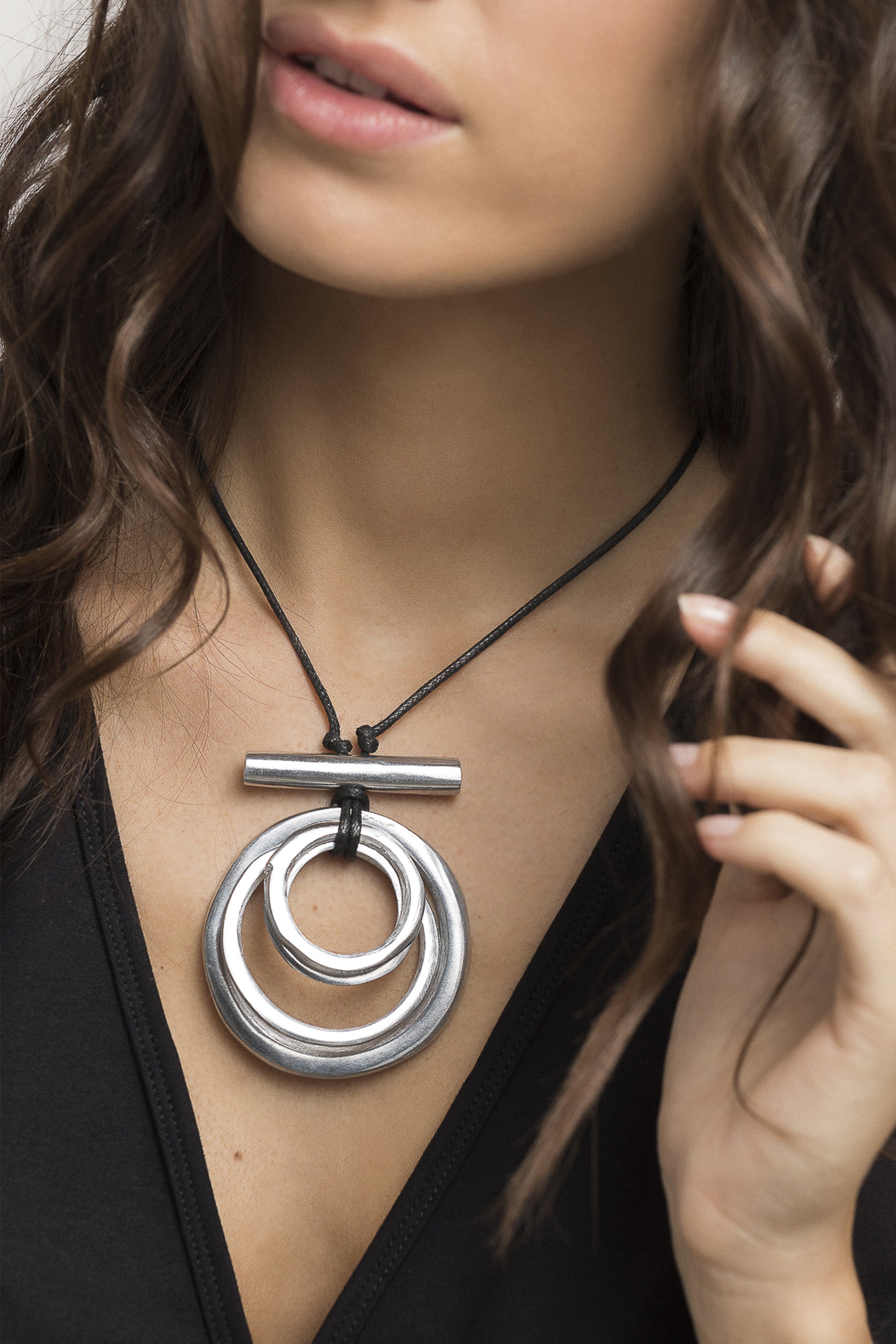 Pendente in alluminio 100% riciclato con barra a T e tre cerchi concentrici dal profilo lucido. Montato su cordoncino nero. Ultraleggero e confortevole sulla pelle. Nickel tested. Lavorazione artigianale. Gioielli fatti a mano, unici e artigianali, perfetti per tutti i tuoi look o come idea regalo.