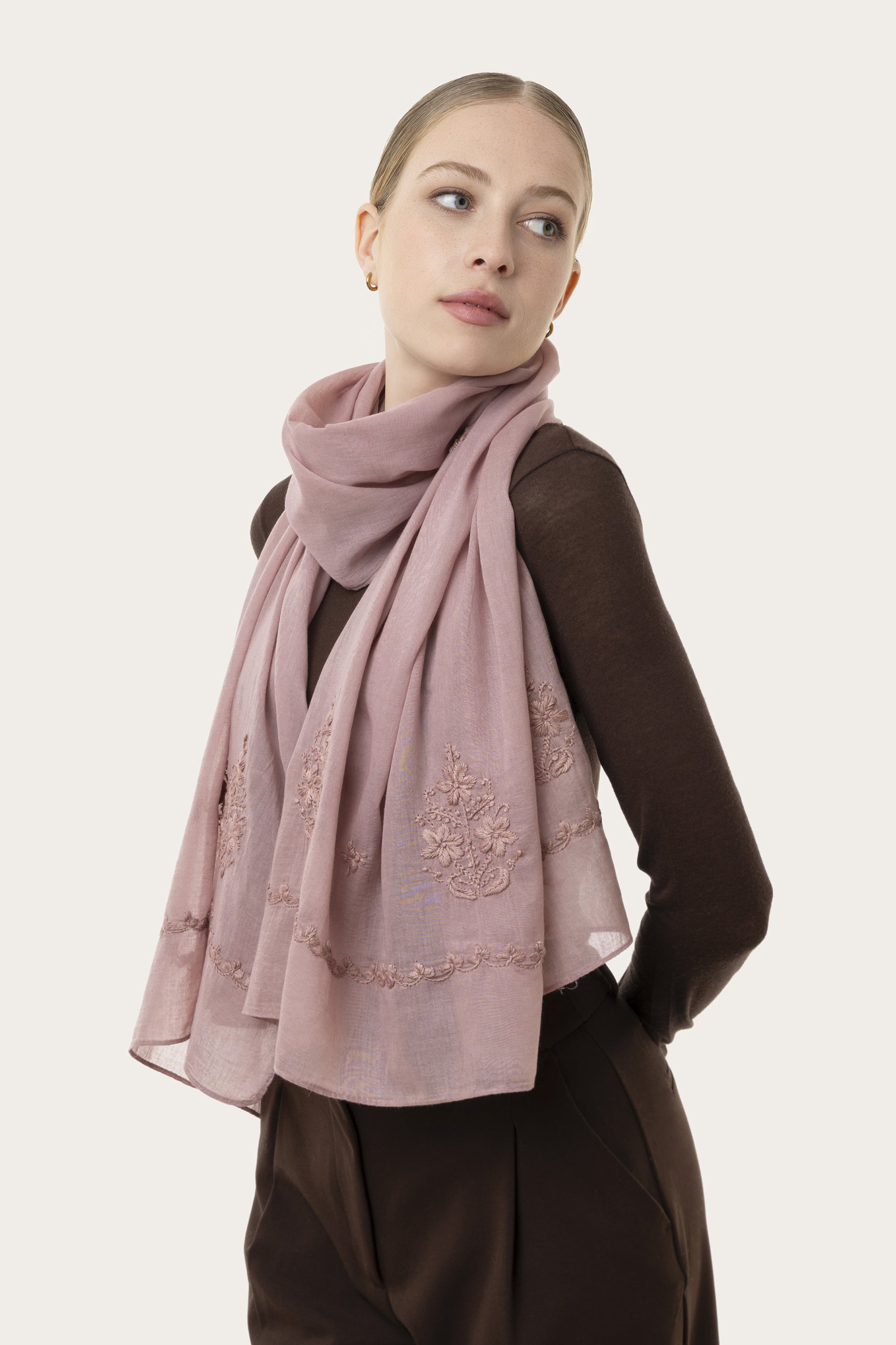La sciarpa Lira è realizzata in 100% cotone. Leggera, morbida e avvolgente, questa sciarpa è disponibile in tre varianti colore, caratterizzate dalla lavorazione stonewashed e da dettagli floreali ricamati a mano. Abbinala ai tuoi gioielli e borse preferite per completare il tuo look. Misura: 70x180cm. Lavorazione artigianale.